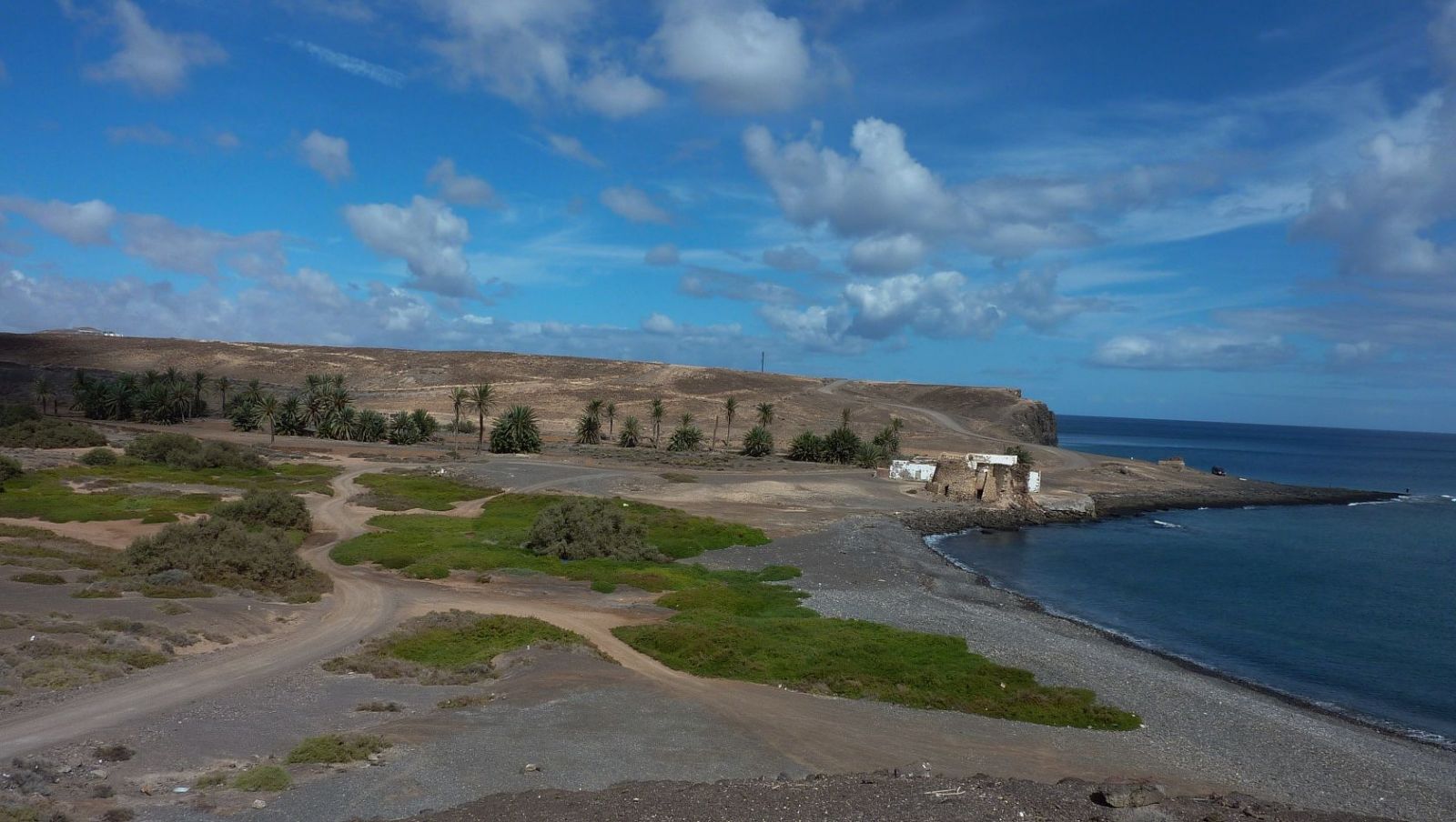Von dort gehen wir in südliche Richtung zum (02) Playa de Las Salinas (16 m), wo es eine Badegelegenheit und ein Restaurant gibt. Im weiteren Verlauf gehen wir an den Häusern vorbei und weiter bis zum Ende der Straße, um dort auf dem beginnenden Küstenpfad zu wandern. Wir gehen direkt auf die weiße, spitz zulaufende Grundstücksbegrenzungsmauer zu. Bevor wir diese erreichen, gehen wir links ein Stückchen bergab, um dann sofort rechts aufzusteigen und halb links den Weg fortzusetzen. Immer wieder umlaufen wir Barrancos weiträumig. So erreichen wir automatisch auf einem der vielen Pfade die Schotterpiste.