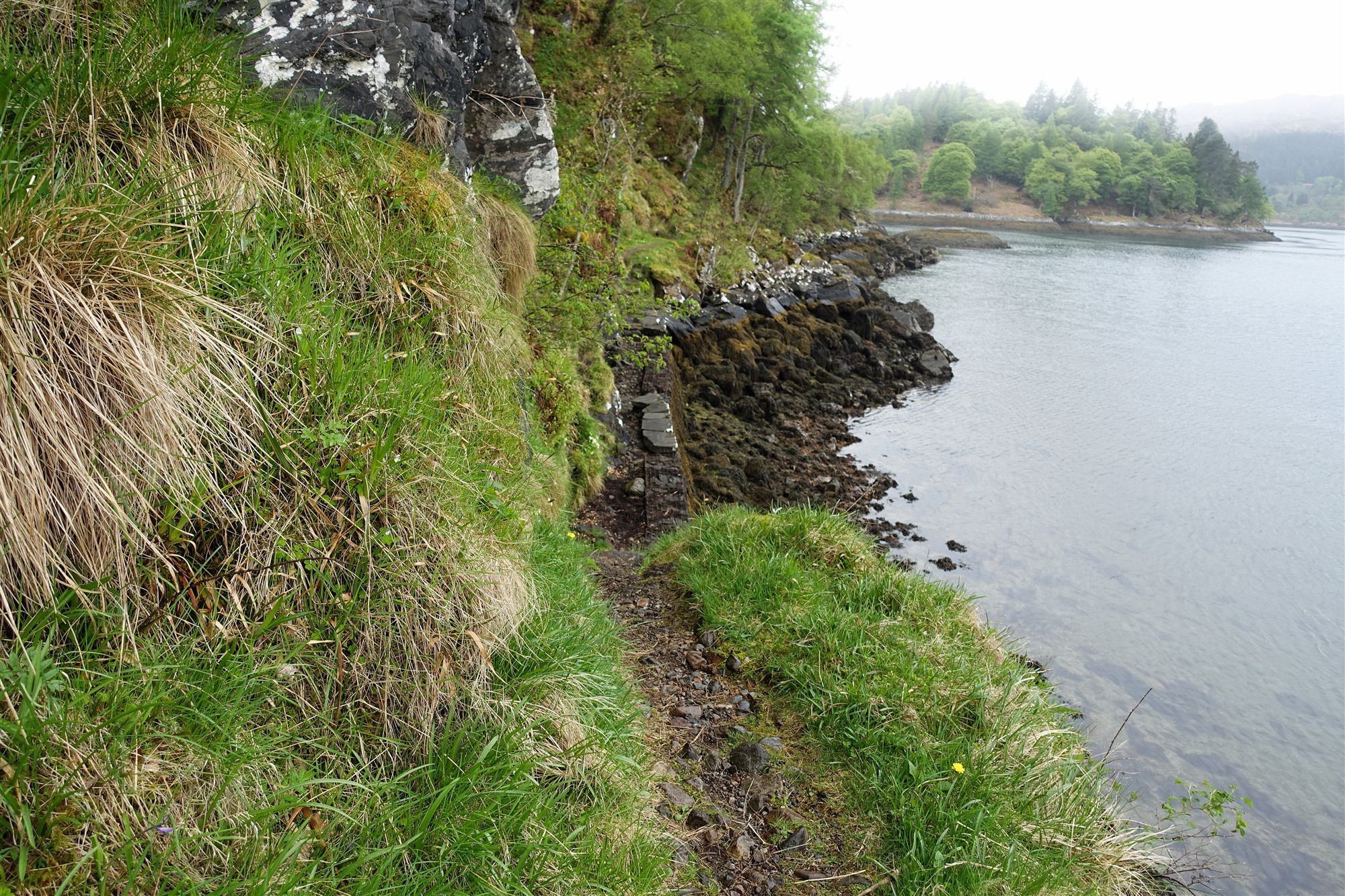 Während des Abstiegs gehen wir bei der Weggabelung halb rechts, links unterhalb sehen wir Ruinen. Der Pfad endet oberhalb des Loch Moidart, wir gehen links auf dem sogenannten 04 Silver Walk (16 m) weiter. Der Silberweg erhielt seinen Namen von einem Schatz aus elisabethanischen Münzen, die während des Baus dieses wunderschönen Küstenpfads gefunden wurden.