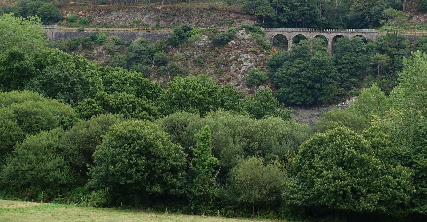 Bei einer Weggabelung gehen wir halb rechts und erreichen nach einigen Metern den 04 Aussichtspunkt Rocher argénté (4 m). Rechts oberhalb thront das Schloss mit seinen zahlreichen Schornsteinen. Auf der gegenüberliegenden Uferseite befindet sich ein Eisenbahnviadukt, über das in den Sommermonaten der Nostalgiezug La Vapeur du Trieux auf der Strecke Paimpol – Pontrieux – Paimpol verkehrt, ein liebevoll restaurierter Museumszug mit Dampflok und fünf alten Wagen. Im historischen Bahnhof von Paimpol beginnt die Reise in die Vergangenheit. An einer Weidefläche angekommen, verlässt der Pfad den Flusslauf und führt links bergauf.