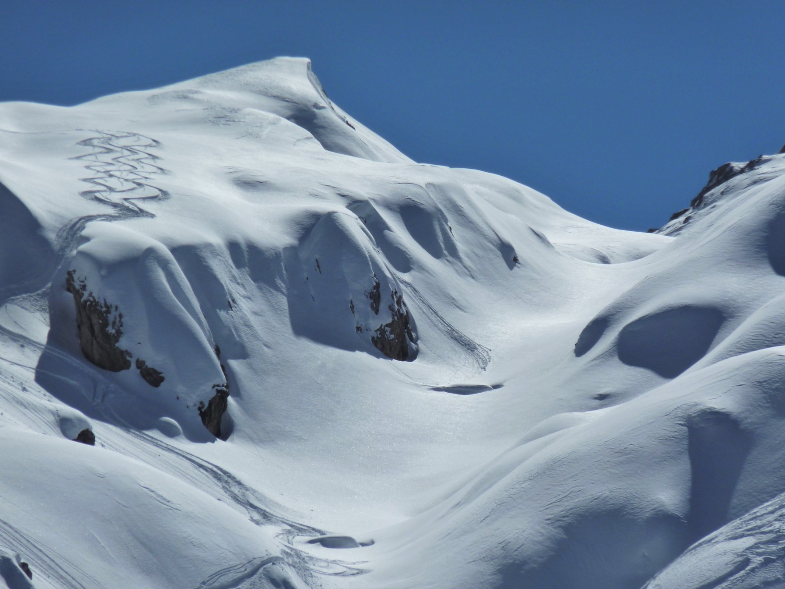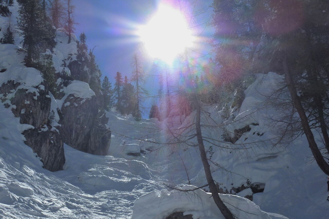 Um die Mittagszeit steht die Sonne direkt über dem schmalen Taleinschnitt. Und wir hatten als Erster eine sensationelle Tiefschneeabfahrt!