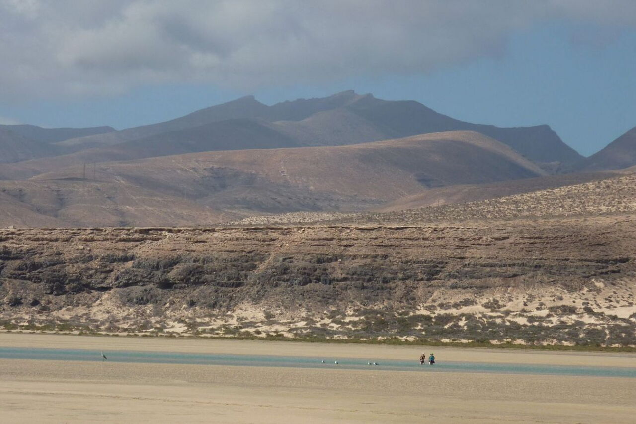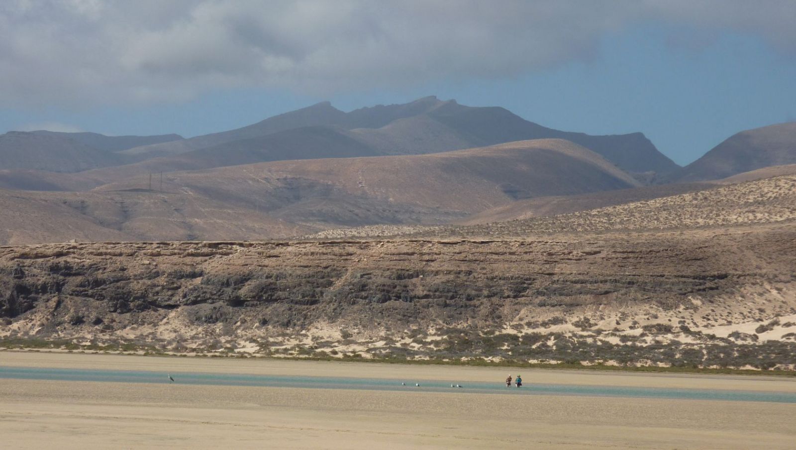 Auf den nächsten 1,7 km orientieren wir uns an der Küstenlinie. Dabei wird zwischenzeitlich je nach Stand der Tide ein Priel durchstiegen, bis wir in der Ferne rechts die Häuseransammlung von Risco del Paso sowie zwei Riesendünen ausmachen können. Von hier beginnt der Rückweg. Wie auf dem Hinweg gehen wir zunächst auf der Landzunge. Bei kompletter Flut sollte man die Lagune an dieser Stelle noch nicht queren, da es tiefere Stellen gibt. Wir gehen ziemlich genau 1 km zurück, bis wir auf der linken Seite in den Dünen einen Parkplatz sehen. Der Wasserstand auf dem Rückweg durch die (04) Lagune zum Festland (0 m) überschreitet an dieser Stelle nicht die Hüfthöhe eines 1,80 m großen Mannes. Zwischen Lagune und Dünenlandschaft wandern wir schließlich Richtung Hotel Melia Gorriones.