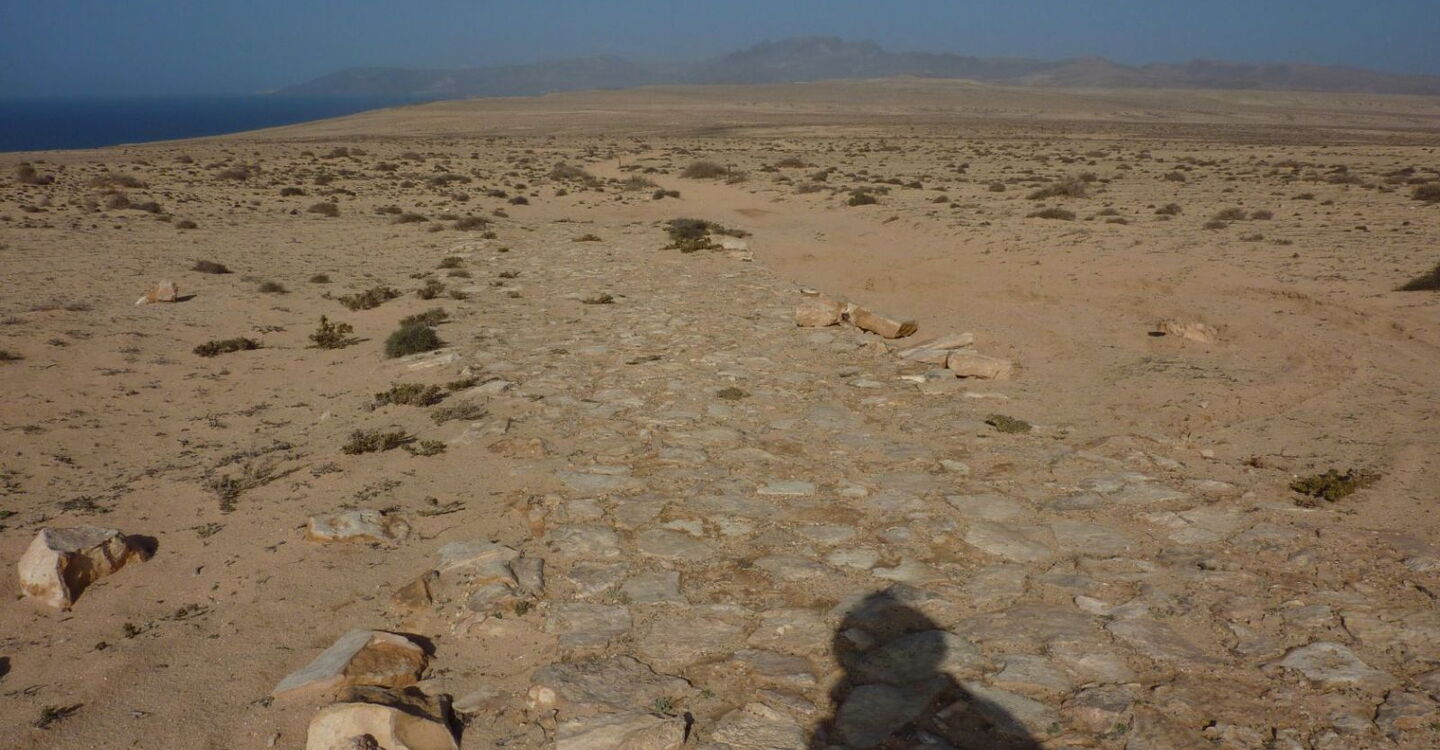 Vom (01) Start und Ziel (37 m) gehen wir in nordöstlicher Richtung auf der Schotterpiste neben der Autobahn, bis wir auf einen Fußgängertunnel unter der Autobahn treffen. Nach weiteren 100 m zweigt halb links ein Pfad ab. Bei der nächsten Möglichkeit gehen wir an der Weggabelung links. Nachdem wir die beiden Steine passiert haben, gehen wir scharf links. Durch eine Rechtskurve gelangen wir auf eine Schotterpiste, die ins Landesinnere führt, immer parallel zu dem links von uns liegenden Barranco. In der Ferne sind bereits zwei große Steinpyramiden auszumachen. Wir gehen an diesen vorbei und befinden uns nun oberhalb einer links von uns liegenden Schlucht. Von nun an markieren Steinmännchen den Weg. Nach 400 m queren wir eine Sandpiste. Der Weg ist nun schwerer auszumachen, aber wir bleiben auf der bereits eingeschlagenen Marschrichtung.