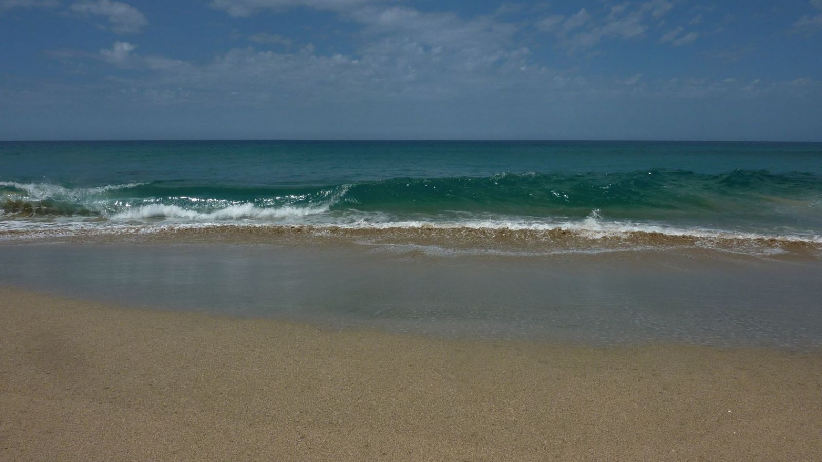 Auf einer ca. 15 m erhöhten Stufe über dem Meer laufen wir auf weißem Sandgestein, vorbei an bizarren vom Wind geformten Objekten, bis wir den fast immer menschenleeren Strand (03) Playa Aqua Liques (15 m) mit seinem sehr feinen weißen Sand erreicht haben. Baden ist aufgrund der hohen Wellen und unberechenbarer Strömungen lebensgefährlich.