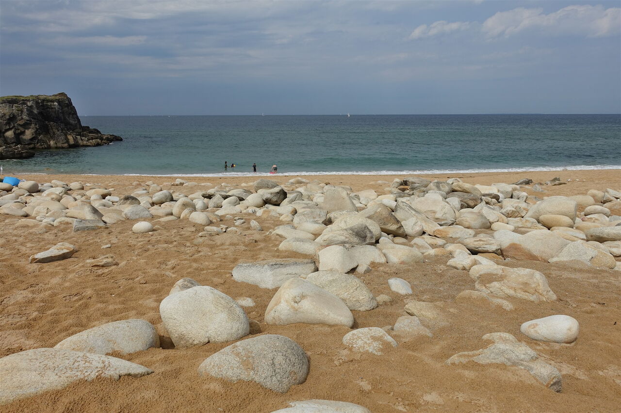 Hinter einer Holzbrücke, gefolgt von einem kurzen Aufstieg, erreichen wir den schönen Sandstrand vom Port Goulom mit verwinkelten und versteckten kleinen Buchten. Besonders schön ist aber der nachfolgende 03 Port Bara (8 m) mit seinen riesigen rund geschliffenen Felsen. Er ist dank der Pointe du Percho besonders gut vor dem meist sehr kräftig wehenden Wind aus Nordwesten geschützt. Immer wieder führen Pfade auf Landzungen zu Aussichtspunkten. Die Wegführung ist stets eindeutig, es geht entlang der Küste.