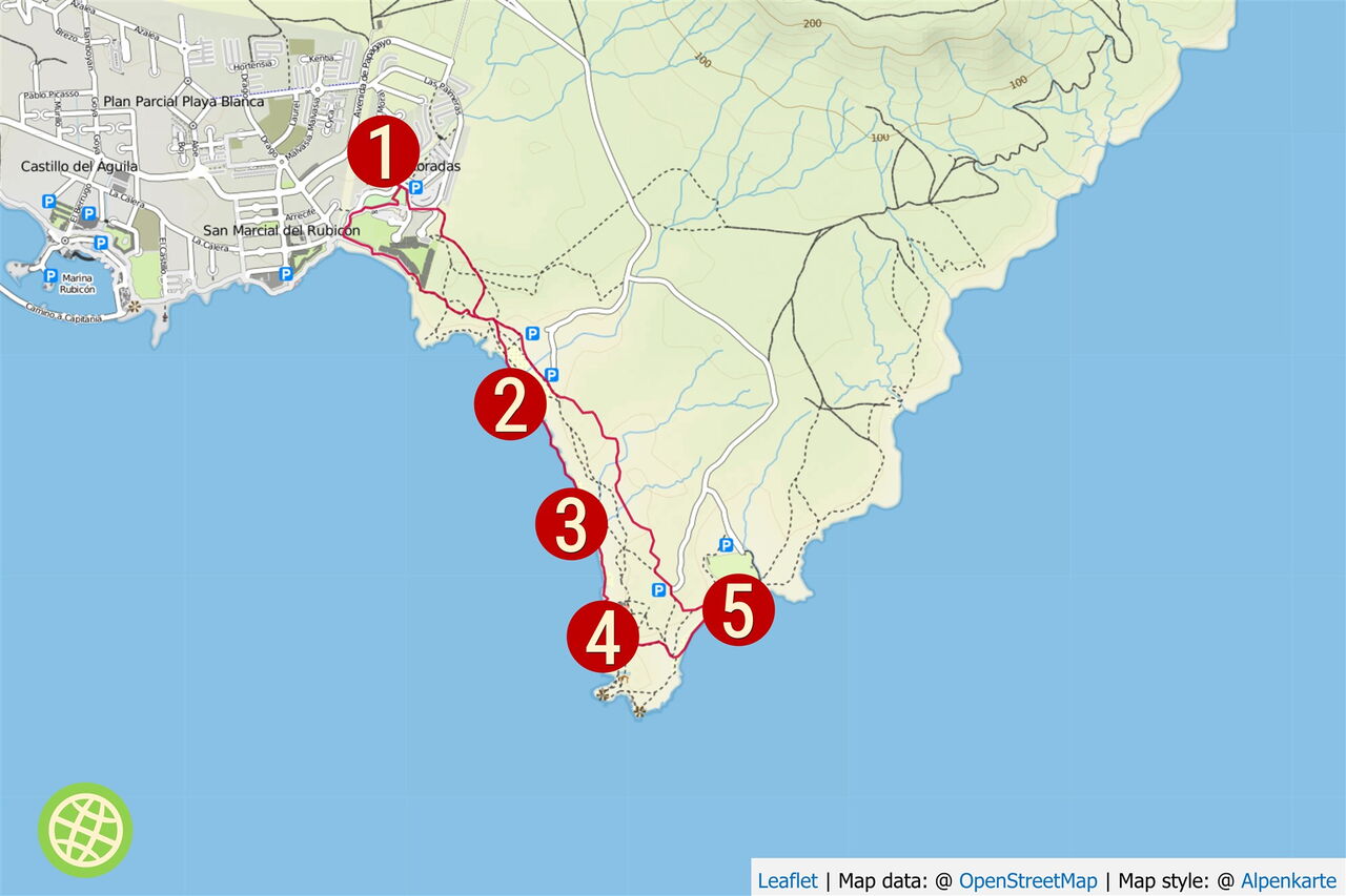 Bei der (01) Bushaltestelle (15 m) gehen wir einige Meter zurück zum Kreisverkehr, queren zunächst rechts den Zebrastreifen und dann bei einem zweiten Zebrastreifen die Straße. Nun gehen wir rechts, vorbei am Dream Hotel Gran Castillo und dem Pkw-Parkplatz, bis zur Strandpromenade vor. Hier gehen wir links, um nach 150 m einige alte Fischerhäuser zu passieren. Nach weiteren 200 m geht es steil, parallel zum Sandos Papagayo Beach Resort, auf die vor uns liegende Klippe.
