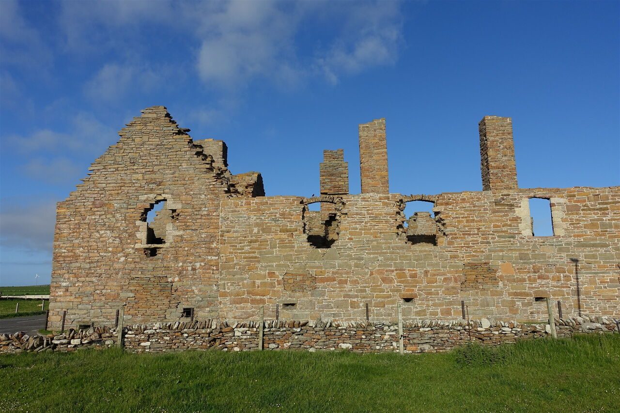Nach 600 m erreichen wir die gering befahrene Anfahrtsstraße und folgen dieser rechts herunter zum 05 Earl's Palace (Birsay) (12 m). Ein verbauter Stein zeigt die Jahreszahl 1574. Das Gebäude diente als Ersatz für den Earl's Palace in Kirkwall und ein Jahrhundert später nutzten es die Earls of Morton. Seit dem 17. Jahrhundert ist das Bauwerk nicht mehr bewohnt und somit dem Verfall preisgegeben.