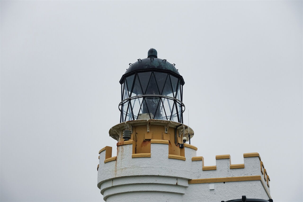 Hinter diesem befindet sich ein erstes kleines Gatter. Hinter dem zweiten Gatter gehen wir an der Weggabelung geradeaus und weiter auf dem grasigen Pfad in Richtung des 03 Lighthouse (52 m). Der 1925 erbaute Leuchtturm ist nur 11 m hoch, steht dafür aber 52 m hoch über dem Meeresspiegel. Von dort aus gehen wir in südlicher Richtung an der spektakulären Steilküste entlang. In den geschützten Felsen nisten Eissturmvögel, Trottellummen, Tordalken und Papageientaucher. Wir überqueren wieder die Meeresenge, steigen die Treppen zum Parkplatz hoch und gehen dort links weiter entlang der Küste, auch ausgeschildert Richtung Skiba Geo.