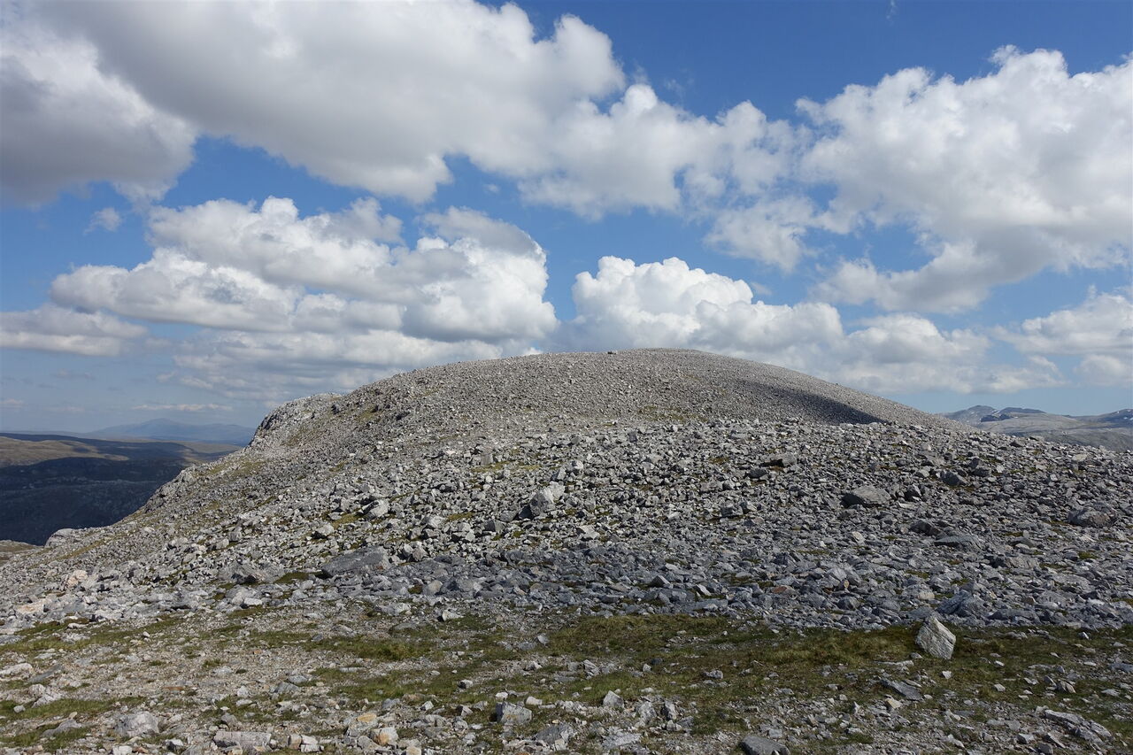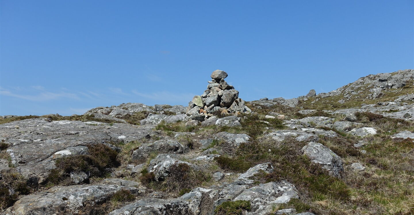 Auf der darauffolgenden Hochebene gehen wir über platt geschliffene Steine bis zum Gipfel des 05 Glas Bheinn (776 m). Zur weiteren Wegbeschreibung: Blickt man vom Gipfel Richtung Osten, so sieht man auf der rechten Seite des Gipfelplateaus einen Steinhaufen. Wir queren die Hochebene ca. 100 m links von diesem Steinhaufen. Danach erreichen wir die östliche Bergflanke des Glas Bheinn, an dessen Grat wir bis zu einer kleinen Senke bergab gehen. An dieser orientieren wir uns halb rechts und gehen ein kleines Stückchen bergauf, um dann auf dem lang gezogenen Bergrücken weiter abzusteigen – auf einem Pfad, der nur schwer auszumachen ist. Bei einer kleinen Einsattelung und einem Steinmännchen fangen wir an, links durch eine steile grasige Rinne in Richtung des im Tal querenden Pfads herabzusteigen. Von dort gehen wir rechts Richtung Straße und Parkplatz.