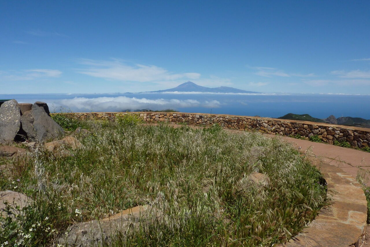Nach 1,4 km treffen wir auf eine weitere Forststraße, folgen dieser halb links weitere 130 m, um dann bei der Weggabelung scharf rechts auf dem gepflasterten Weg bis zum (05) Alto de Garajoney (1487 m) aufzusteigen. Er ist die höchste Erhebung der Insel und überragt das umliegende Hochplateau um wenige Meter. Auch wenn das Dach von La Gomera daher kein exponierter Gipfel ist, haben wir einen imposanten Ausblick auf die gesamte Insel. Bei guter Sicht kann man sogar die Nachbarinseln Teneriffa, La Palma und El Hierro ausmachen. Oft hüllen aber fette Passat-Wolken die Bergspitze ein. Wir überschreiten den Gipfel und laufen auf einem Bergrücken in nordöstlicher Richtung, bis in einer Mulde links ein Pfad abzweigt. Nach 50 m gelangen wir auf den gepflasterten Weg, um auf diesem rechts herunter bis zum Ausgangspunkt laufen.
