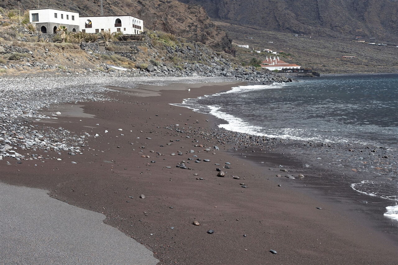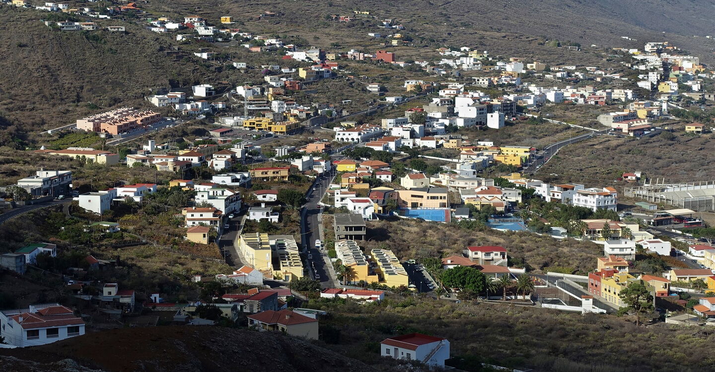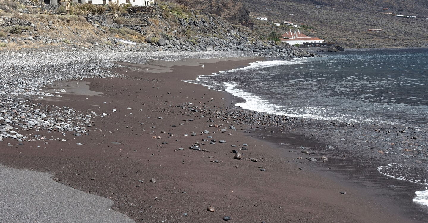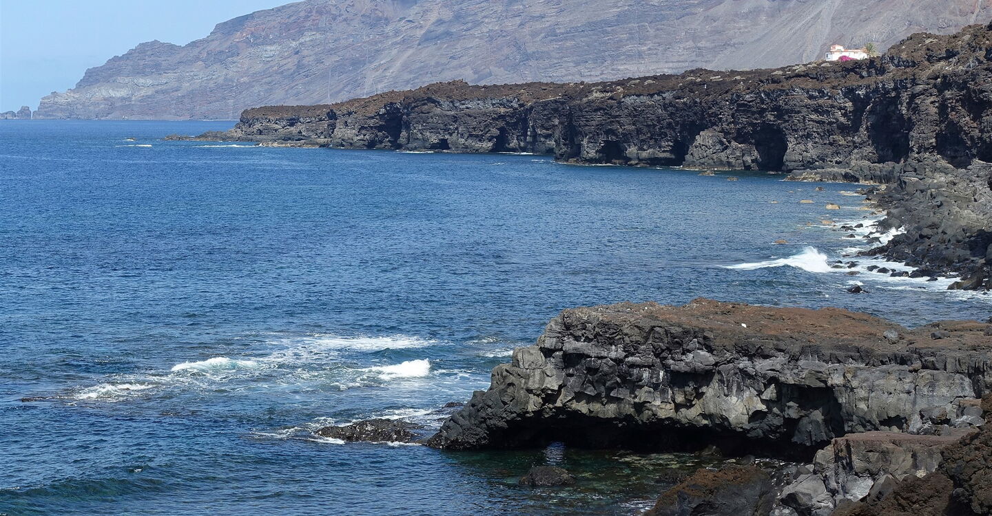Von der Landzunge am Playa de Los Corrales im Halbrund des (01) El-Golfo-Tals (16 m) steigen wir wieder zur Verbindungsstraße von Las Puntas nach Sabinosa auf und queren diese nach halb rechts, um auf der bergauf führenden Straße entlang von gepflegten Grundstücken bis zu deren Ende aufzusteigen, das sich kurz hinter einem Wasserreservoir befindet.