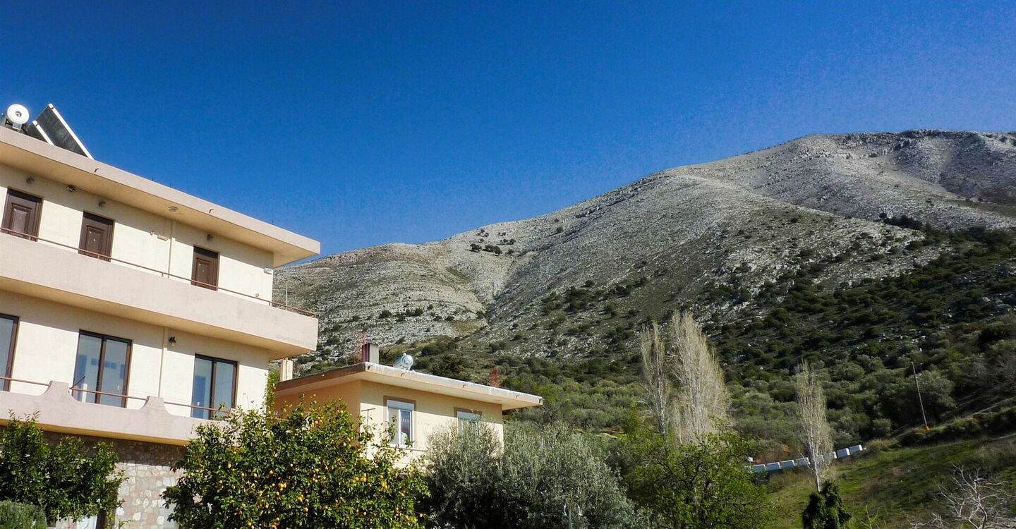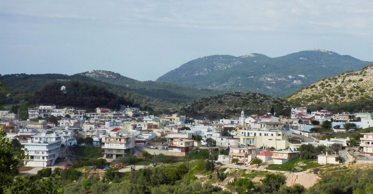 Vom (01) Start und Ziel beim Hotel Attaviros (433 m) gehen wir direkt neben dem Verkehrsspiegel halb rechts auf der betonierten Piste bergab und verlassen diese in der folgenden Rechtskurve geradeaus – dabei gehen wir rechts an einer kleinen Ruine vorbei. Mauern rechts und links des Weges begrenzen teilweise den alten Weg vom Dorf zu den Feldern. Schon bald sehen wir von unserer Position auf dem leicht ansteigenden Pfad links oberhalb einen Souvenirladen. Wir treffen bei einem Hundezwinger auf eine Schotterpiste, der wir scharf links folgen, um nach 120 m rechts auf dem ansteigenden Bergrücken weitere 70 m über eine Freifläche aufzusteigen. Drehen wir uns um, so ergeben sich traumhafte Blicke über das Dorf Embona, den dahinter liegenden Berg Profitis Ilias – zu erkennen an den Funkmasten – und halb rechts von uns auf den höchsten Berg der Insel, den 1216 m hohen Attaviros.