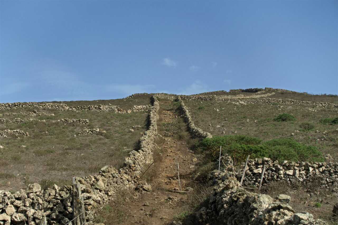 In Verlängerung der ursprünglichen Wegrichtung gelangen wir auf einen gelb-weiß markierten Pfad. Auf der La-Dehesa-Hochebene kommen wir an weiteren Prachtexemplaren von Zedernwacholder und einem Steinhaus vorbei, bevor wir eine Schotterpiste queren und den (03) Mirador Bascos (665 m) erreichen. Aufgrund eines Erdrutsches ist dieser gesperrt, aber auf dem daneben liegenden Gipfel ist die Aussicht mindestens genauso beeindruckend.