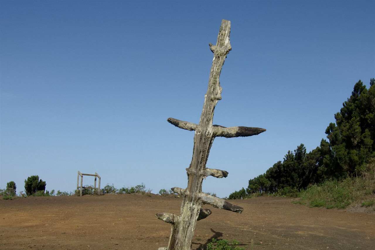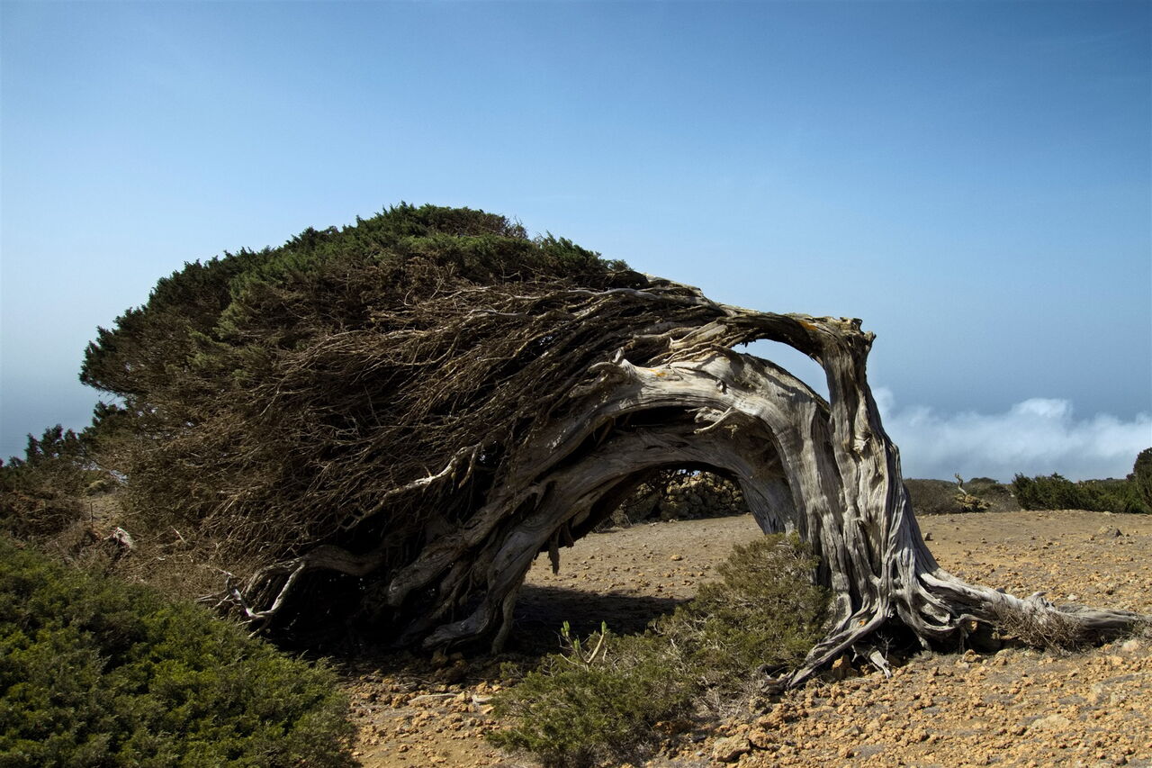 Wir gehen über Viehgitter, kommen vorbei an Kanarischen Kiefern sowie Zedernwacholder und gelangen an eine Weggabelung. Geradeaus geht es weiter zum Mirador. Wir gehen jedoch scharf links auf der Piste weiter. In der darauffolgenden scharfen Rechtskurve der Piste führt links ein Pfad zu einem ersten Prachtexemplar der Zedernwacholderbäume. Wieder auf der Piste erreicht man nach 425 m den bekanntesten aller Bäume, den (02) El Sabinar (599 m). Dabei handelt es sich um einen sogenannten Windflüchter, seine Wuchsform wird von der Windrichtung der Nordwestpassatwinde bestimmt. Fallwinde drücken Passatwolken über den Bergkamm und liefern somit das Lebenselixier der Bäume, Feuchtigkeit. Einst war der Bestand zahlreicher, denn die Bäume mussten Weideland weichen. Heutzutage regeneriert sich der Baum wieder und vielerorts sind junge Exemplare zu sehen.