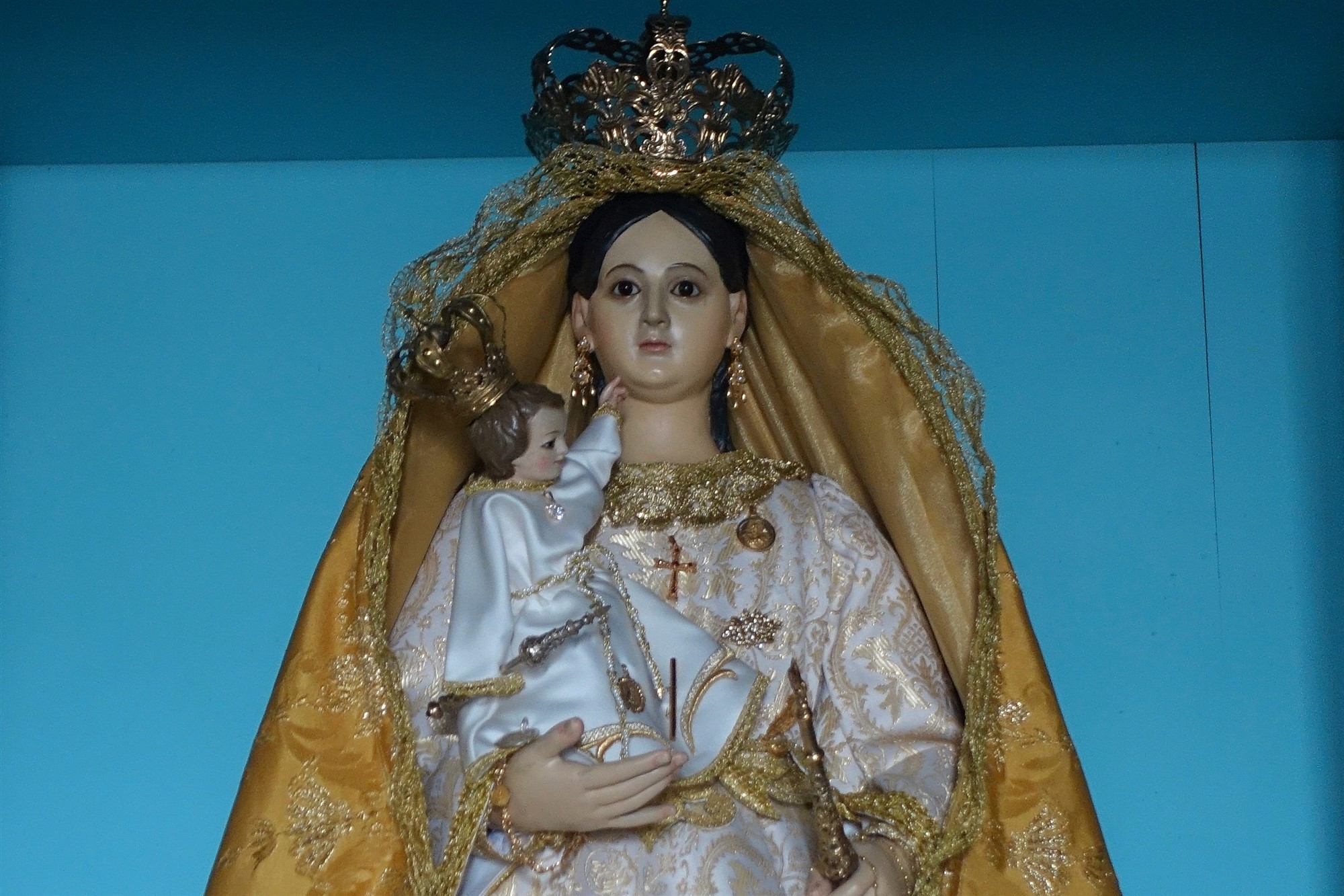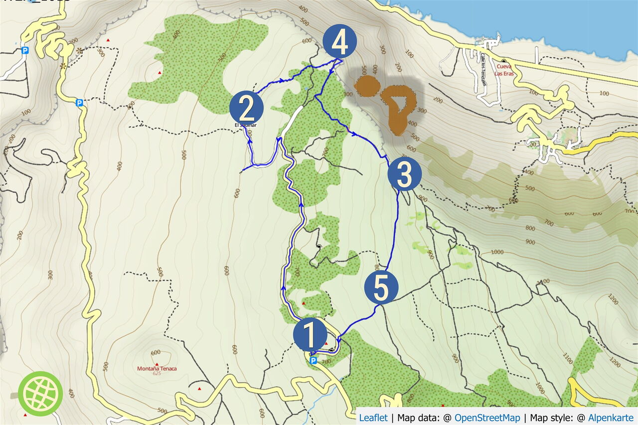 An der linken Seite des Vorplatzes der (01) Ermita Virgen de Los Reyes (716 m) gelangt man durch eine Pforte auf die Straße, quert diese und geht auf der Piste Richtung Cueva de La Virgen. Lange Zeit war die Marienfigur der heiligen Jungfrau in diesen Höhlen untergebracht, bevor sie dann ihren Platz in der Kirche fand. In Verlängerung des bereits eingeschlagenen Weges gelangen wir zu einer Anhöhe und folgen dem Pfad durch eine Senke bis zur Piste.