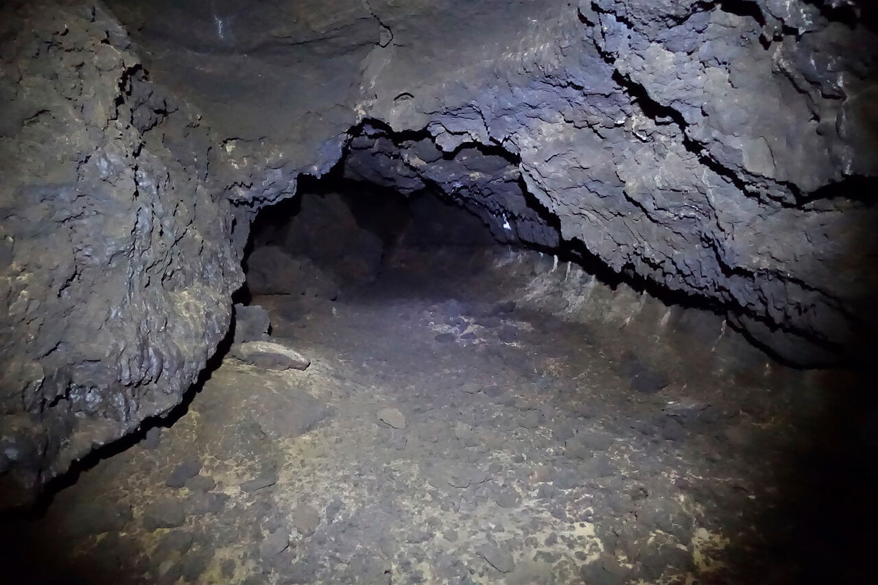 Ein solcher Lavatunnel entsteht, wenn flüssiges Magma für längere Zeit sehr gleichmäßig innerhalb eines Lavastroms fließt. Dabei bildet sich zunächst ein Lavakanal, an dessen Oberfläche das Material langsam abkühlt, wodurch sich eine Decke ausbildet. Unterhalb der Tunneldecke kann die Lava aber weiterhin fließen, da sie von der kühleren Luft isoliert ist und für längere Zeit ihre hohe Temperatur hält. Erlischt die Förderung, so fließt das Material noch aus der Röhre heraus; was bleibt, ist der Lavatunnel. Während der Expedition durch die Höhle ist die Tunneldecke an einigen Stellen eingebrochen und es sind Öffnungen entstanden, sogenannte Skylights. Schlussendlich erreichen wir den (02) Ausgang der Cueva del Faro (100 m), auf einem Pfad laufen wir bis zur Schotterpiste.