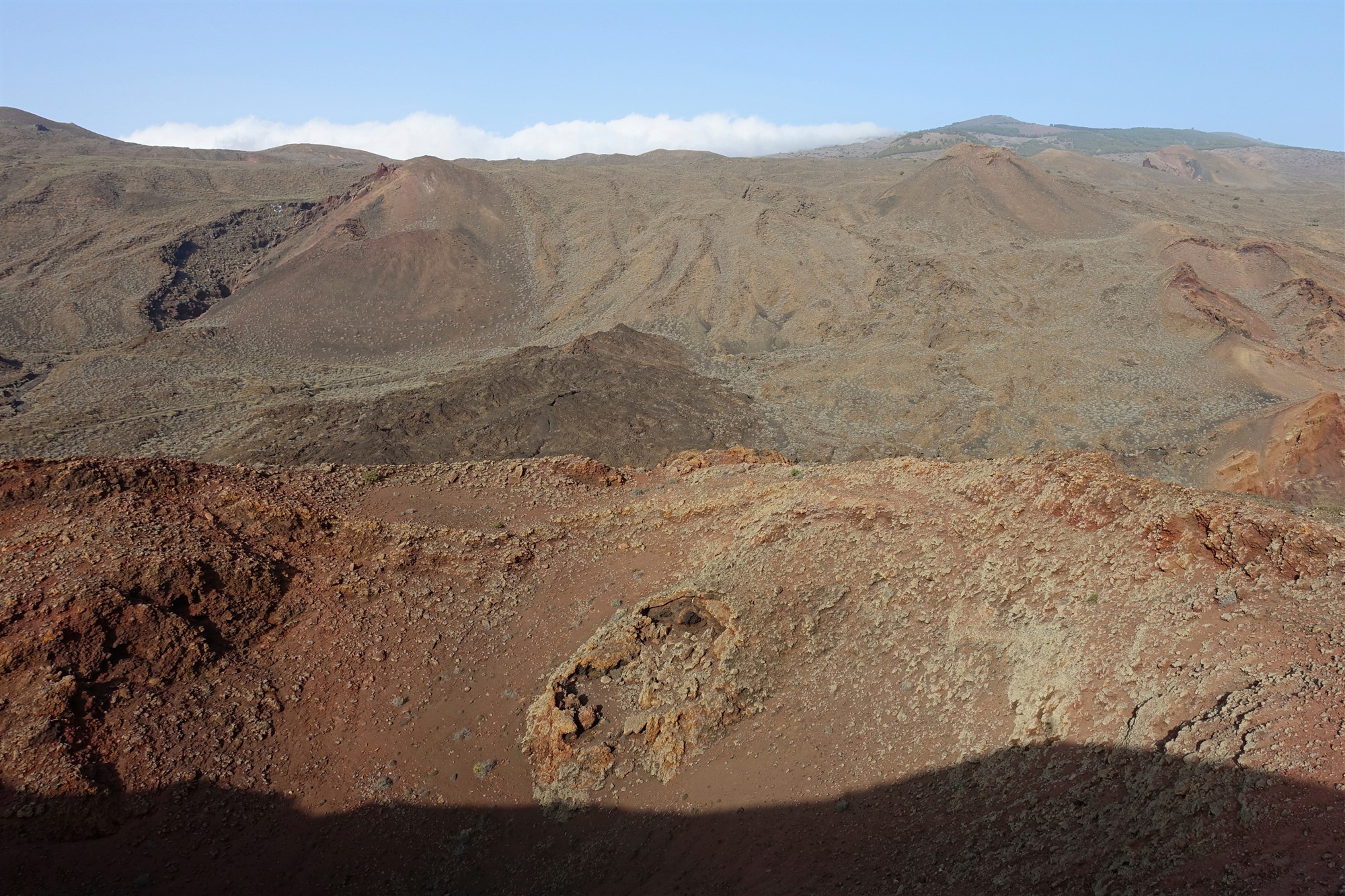 Exakt auf Höhe des Abzweigers zum Leuchtturm gehen wir auf der gegenüberliegenden Straßenseite weglos auf einer gedachten Linie zwischen unserem Standort und der weißen Messsäule der (03) Montana de Orchilla (221 m) bergauf. Wir wandern rechts an einem ersten kleinen Vulkankegel vorbei, um dann kurzfristig auf einem Pfad zu einem zweiten Vulkankegel zu gelangen, der halb rechts von uns liegt. Kurz vor zwei mächtigen Vulkanbomben steigen wir links zum Vulkankrater auf, der mit einem herrlichen Panoramablick aufwartet.