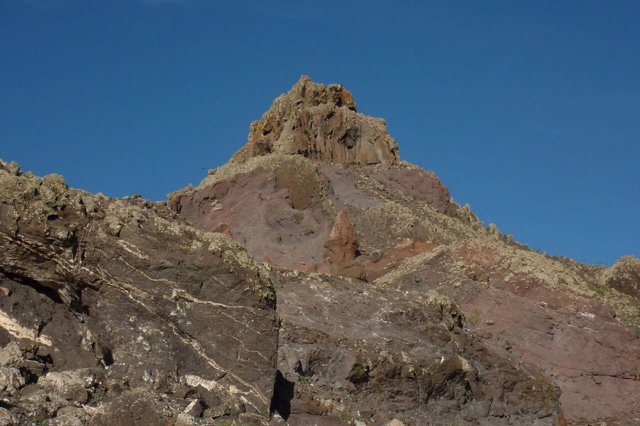 Um das (04) Naturdenkmal Montana Cardon (669 m) final zu besteigen, gehen wir ca. 80 m unterhalb des Felssockels weiter, bis wir links – durch einen kleinen, einfach zu begehenden Kamin – einen höher liegenden Felssockel erreichen. Auf diesem gehen wir nun die 80 m in die entgegengesetzte Richtung zurück, bis der Pfad eine Rechtskehre macht und aufgeschüttete Steine den Hinweis für den Aufstieg geben. Unter Zuhilfenahme der Hände erreichen wir den höchsten Gipfel.