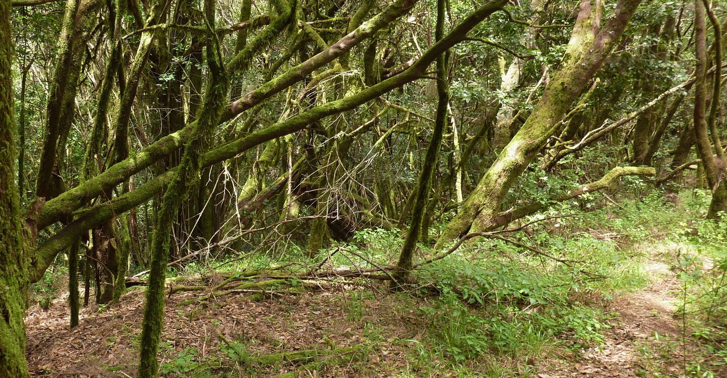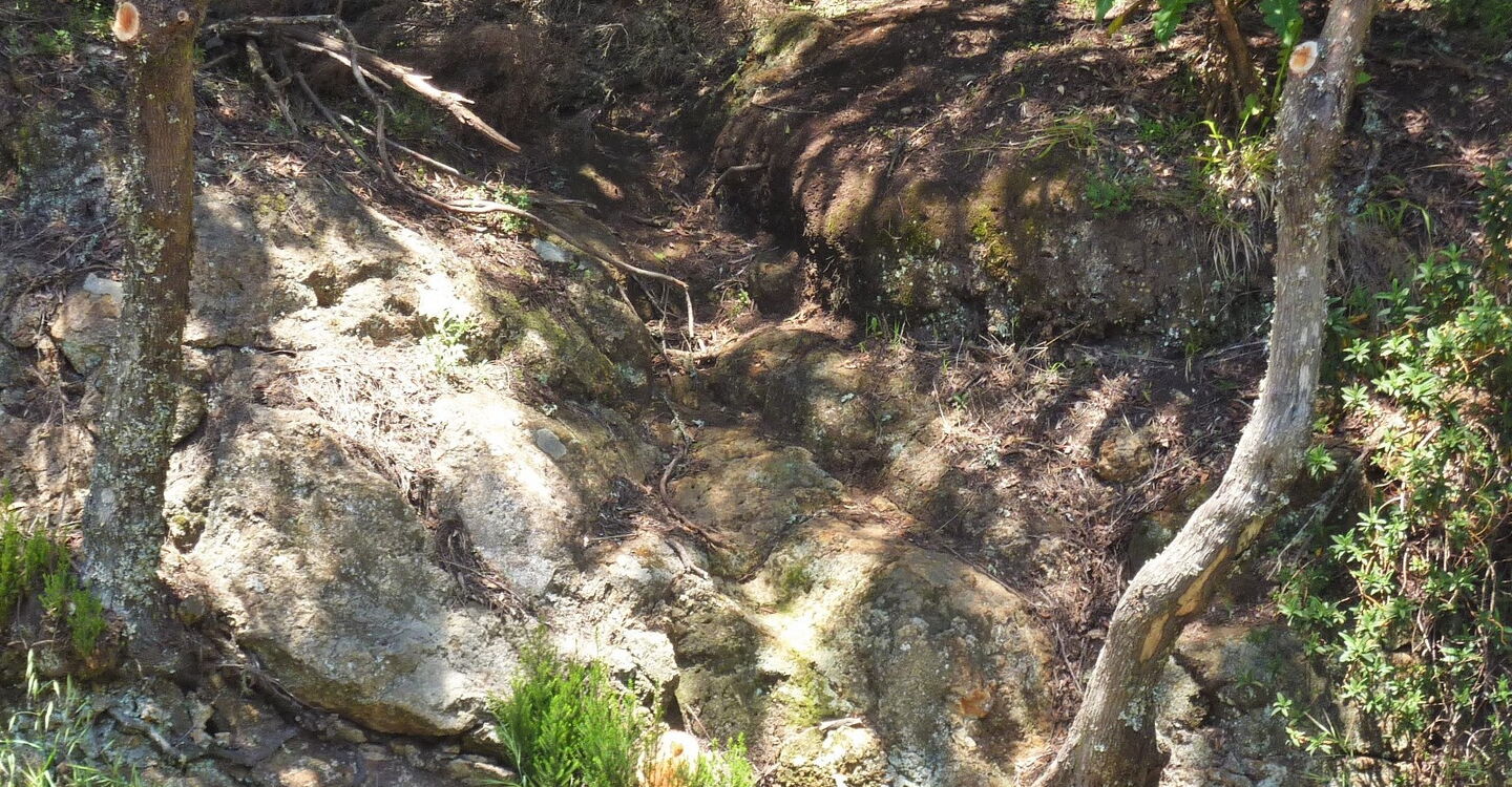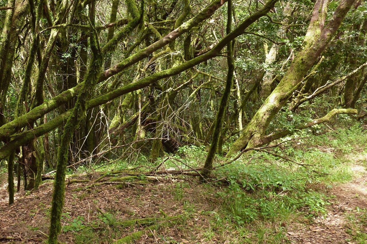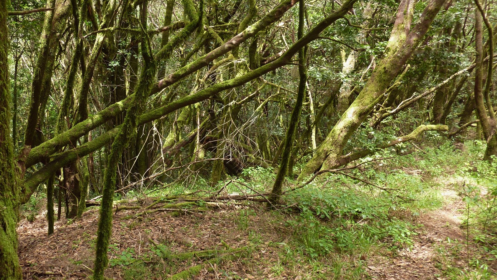 Aufgrund der windgeschützten Lage, und dass es keine Waldbrände in der jüngeren Vergangenheit gab, führt die Wanderung auf diesem Abschnitt durch den ältesten Baumbestand auf La Gomera. Nach 380 m vernimmt man das Plätschern eines Baches, und dann plötzlich taucht er aus dem Dickicht der Bäume auf, ein riesiger, 7 × 12 m großer (04) Fels (803 m). Geht man rechts oder links am Felsen vorbei, befinden sich dort noch weitere Felsen, aber nicht zu mächtig wie der am Wegesrand.