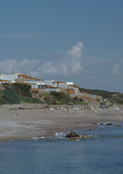 Hinter der scharfen Landspitze mit einer auffälligen, vom Wind geformten Steinskulptur erreichen wir die (05) zweite Traumbucht (3 m). Sie ist etwas felsiger und teilweise hat sich Müll angesammelt. Vorgelagerte Felsen erschweren den Gang ins Wasser. Wir gehen bis zum Ende der Bucht und steigen in einer Erosionsrinne auf die 30 m hohe Klippe. Dort orientieren wir uns zu den halb links liegenden Ruinen und auf der beginnenden Schotterpiste herunter zur Taverne.