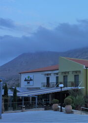 An der Weggabelung gehen wir halb links weiter, anschließend bei der nächsten Möglichkeit rechts, um nun parallel zum Wasserreservoir zu laufen. An dessen Ende bei der Weggabelung halten wir uns halb links. Nach 460 m überqueren wir eine Brücke nach links und erreichen das Dorf Lampiotes. Dort bleiben wir bei dem ersten Verkehrsspiegel auf der Hauptstraße und bei dem zweiten Verkehrsspiegel gehen wir geradeaus weiter. Nach 2,5 km erreichen wir einen Eichenwald, von links mündet eine Piste auf den Hauptweg – unser weiterer Weg, wenn wir nicht die Exkursion zum 02 palastartigen Komplex (352 m) machen. Nach weiteren 70 m gehen wir halb rechts auf dem mit einem roten Punkt markierten Pfad. Wir kommen an einer Quelle vorbei und gehen rechts durch das Dorf Monastiraki, um dann bei dem blau-grün gestrichenen Geländer rechts hinunter zu den Ruinen eines minoischen Palasts aus der Zeit von 1900 bis 1700 vor Christi zu gehen. Achtung! Die Anlage ist montags geschlossen.