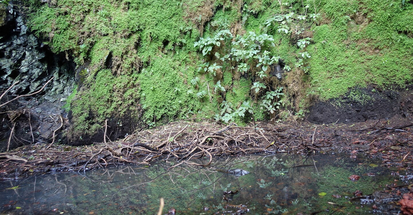 Unterhalb von kräftig grün bewachsenen Felsen verjüngt sich der Pfad. Wir erreichen einen 20-25 m hohen Wasserfall, die (05) Fuente de Mencafete (1000 m). Beeindruckend ist die Ruhe an diesem Ort, nach langen Trockenperioden hört man nur das Geräusch von tropfendem Wasser – der Wasserfall führt kein Wasser mehr. Geht man auf dem gesicherten Weg weiter bergauf, so erreicht man zwei angelegte Wasserreservoirs. Sind diese gefüllt, so wird das überlaufende Wasser zu einem riesigen Reservoir weitergeleitet, welches man über einen etwas rutschigen Treppenweg erreicht. Auch befinden sich am Wegesrand aus Stein gemeißelte Wassertröge. Vergleicht man diese verborgene Welt mit ihrer üppig grünen Vegetation mit dem wüstenähnlichen Klima von La Restinga, das nur 6,5 km entfernt liegt, so kann man diesen Kontrast kaum verarbeiten. Auf dem Rückweg gehen wir auf der Schotterpiste bis zum Ausgangspunkt zurück.