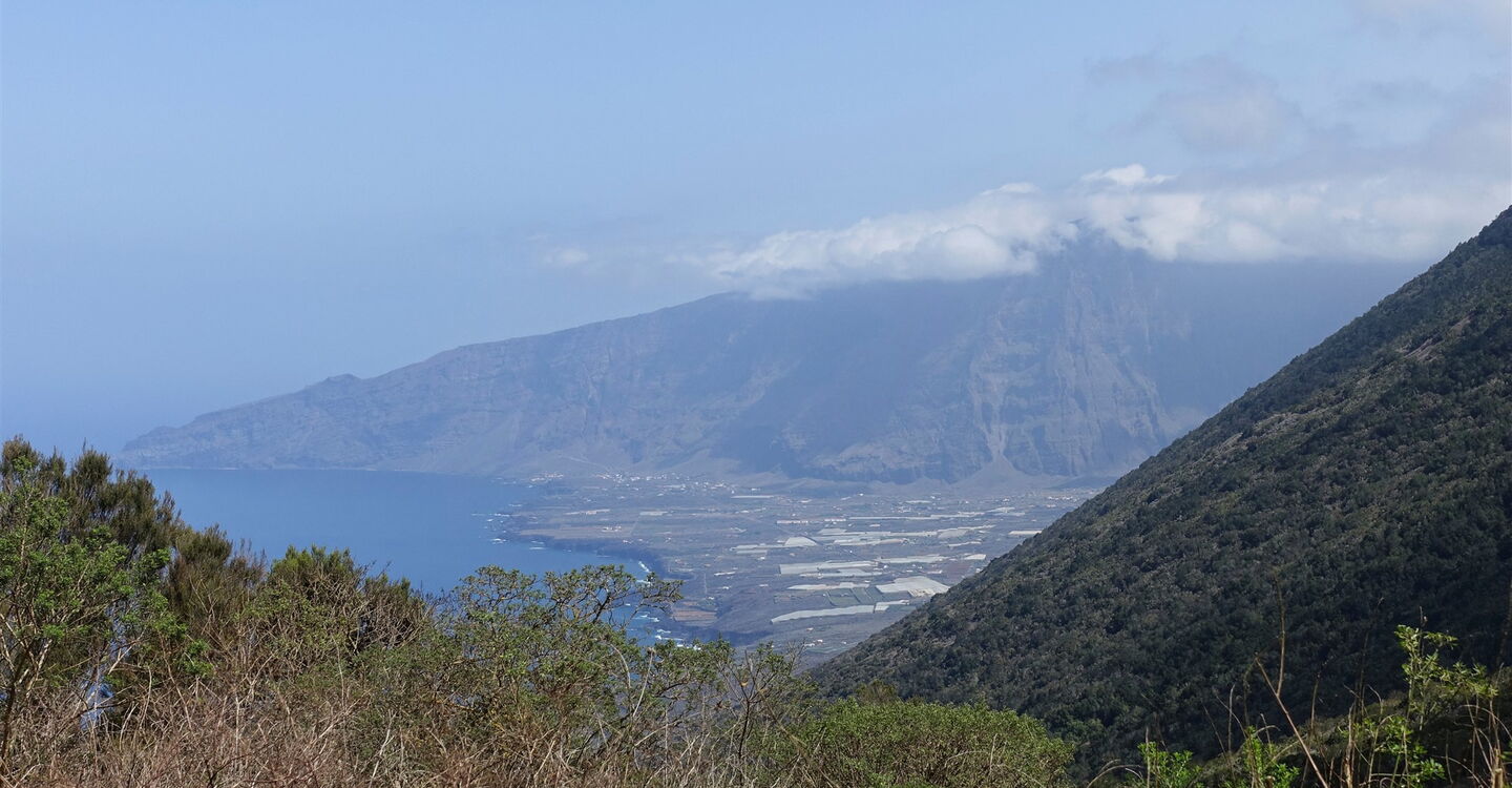 Kurz hinter einem grünen Gatter verlassen wir die Schotterpiste nach halb rechts. Auf dem (02) Camino Sabinosa (816 m), einem historischen Verbindungsweg zwischen den Orten Sabinosa und El Pinar, gehen wir bergab Richtung Pozo de La Salud. Obstbäume und üppiges Grün am Wegesrand zeugen von reichlich Wasservorkommen. Auch gibt der Wald immer wieder den Blick auf den Atlantischen Ozean und die umliegende Bergwelt frei.