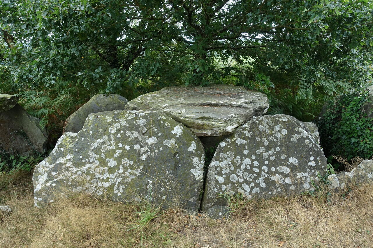 Einen rechten Abzweiger ignorieren wir. Bei einem Holzgatter und einer nachfolgenden Weggabelung gehen wir geradeaus Richtung Gouarec. Kurz später erreichen wir die erste von zwei Megalithanlagen. Die zweite, die 03 allée couverte du Néolithique (246 m), wird auf 5000 bis 2000 Jahre v. Chr. datiert. Wir lassen sie auf der rechten Seite liegen und gehen nun auf einem außergewöhnlichen Höhenweg durch eine beeindruckende Hochmoorlandschaft. Der Pfad führt vorbei an gespenstisch anmutenden Häusern, in denen bereits Bäume ihr Zuhause gefunden haben. Sobald man unterhalb im Tal die ersten Häuser sieht, gabelt sich der Weg, beide Wege führen zum Ziel. Am Parkplatz nahe der Hauptstraße gehen wir scharf rechts, nun wieder leicht bergauf auf einem Hohlweg.