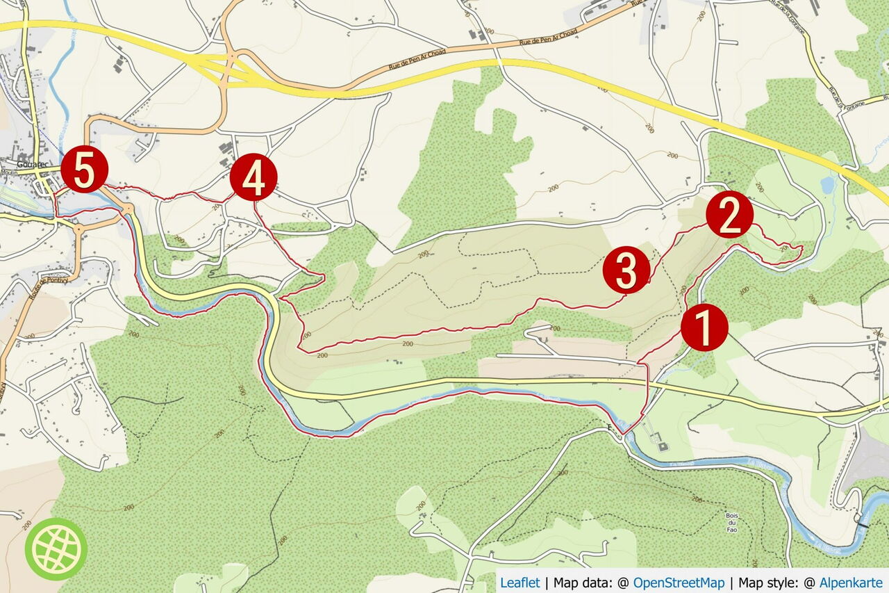 Wir ignorieren die Seitenstraße auf der linken Seite sowie den kurz darauf folgenden Pfad – auch wenn dieser ausgeschildert ist – und gehen bis zur Hauptstraße. Gegenüber der Tankstelle befindet sich auf der linken Straßenseite eine neue Attraktion, das 05 Vélorail du Kreiz Breizh (133 m). Hier fährt man mit eigener Muskelkraft auf einer Draisine über eine alte Eisenbahnlinie entlang des Kanals. Direkt hinter der Tankstelle, wo die Miniatureisenbahn steht, biegen wir links in die Rue de la Gare ab. Wir überqueren den Flusslauf und gehen bei dem nachfolgenden Stoppschild links. Nun überqueren wir den Kanal. Hinter der Brücke gehen wir links auf einem breiten Fahrradweg entlang des Kanals bis zum Ausgangspunkt.