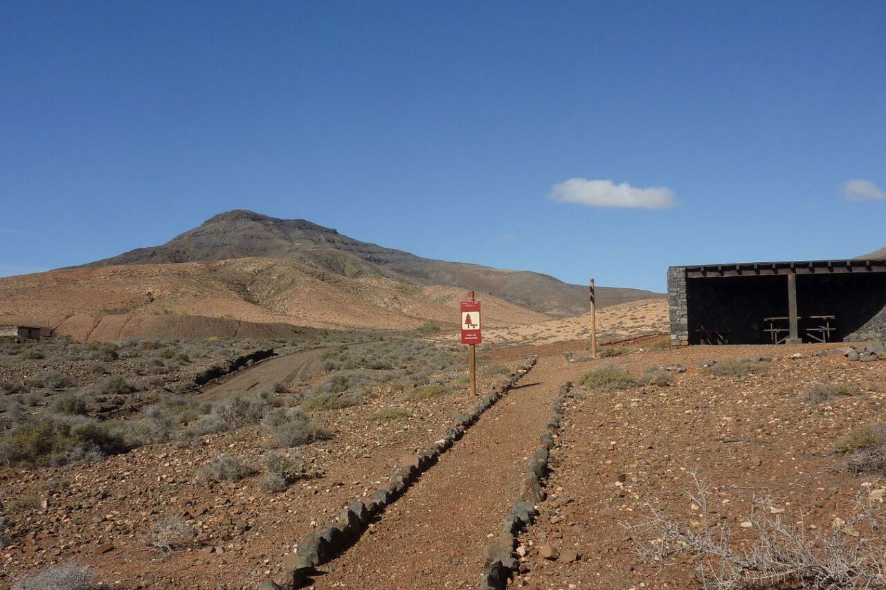 Busanbindung: Linie 11. Pkw-Anfahrt: Von der Costa Calma 16 km über die FV-56 und FV-618. Gleich nach der Ortseinfahrt von Cardon nehmen wir die dritte Einfahrt rechts, direkt durch das Barranco. Dort fahren wir weiter, bis wir auf der rechten Seite ein Picknickhaus sehen und nach 180 m bei der Weggabelung parken. Geokoordinaten Parkplatz: 28.275469 -14.135942.