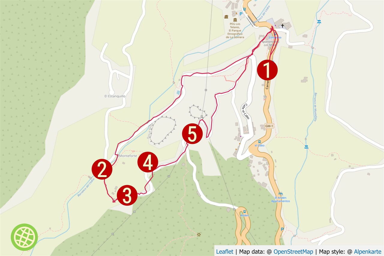 Gemütlicher Spaziergang auf guten Wegen. Art des Weges: 10 % Pfade, 30 % Wege und 60 % Asphaltstraßen. Ausrüstungsempfehlung: keine. Es gibt verschiedene Einkehrmöglichkeiten in Hermigua. Dieser Spaziergang kann zu jeder Jahreszeit unternommen werden. Tipp: Besuch der Iglesia de Santo Domingo de Guzmán.