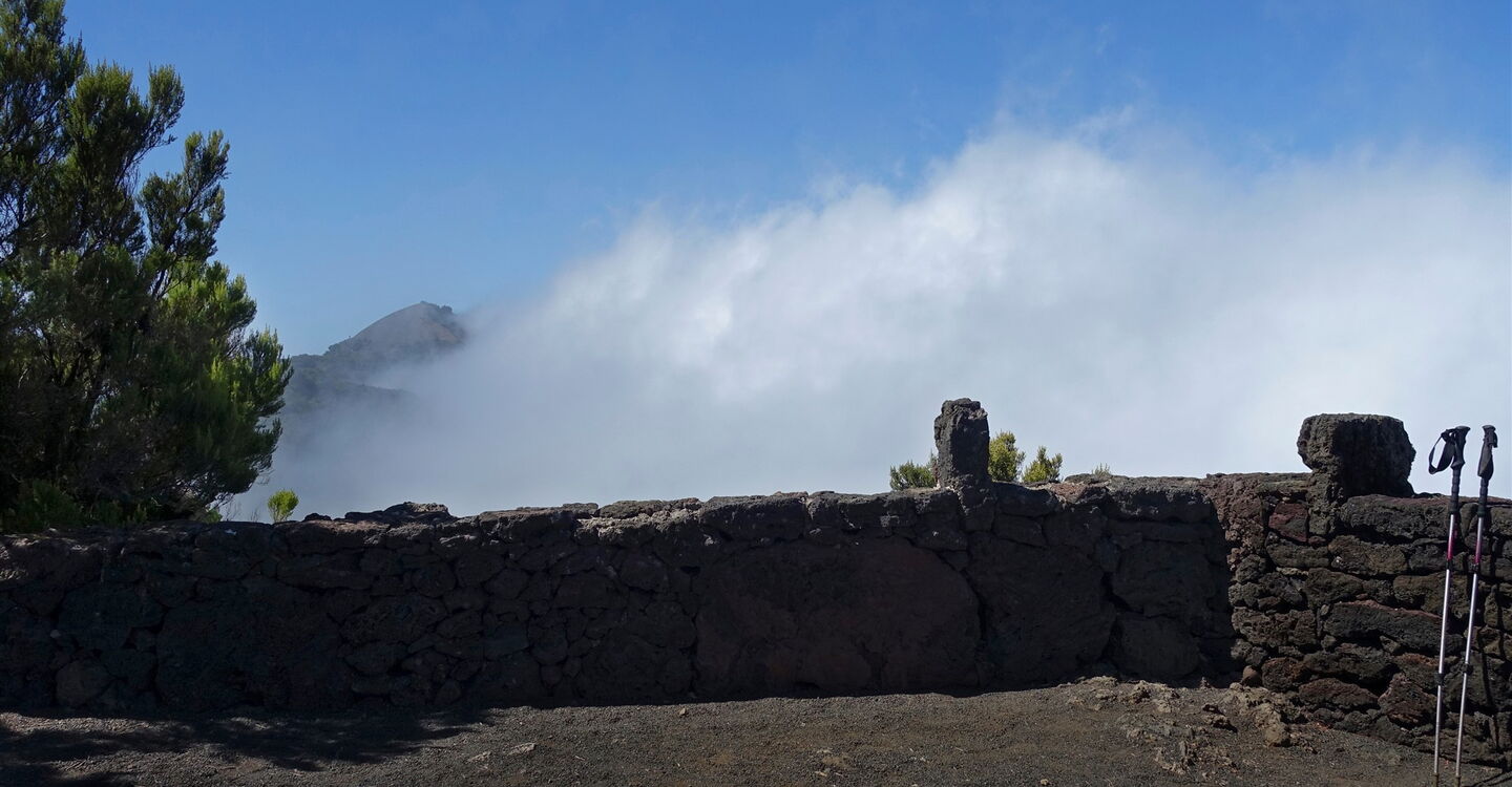 Gelegentlich treffen wir auf Überreste von Mauern, so auch bei einem Felsenvorsprung mit einem wunderschönen Ausblick. An dieser Stelle gehen wir nicht an dem Felsen vorbei, sondern noch vor dem Felsen und der Mauer halb rechts weiter bergauf. Parallel zum Pfad abgelegte Baumstämme und vereinzelte Steine helfen bei der Orientierung, bis wir zu einem Picknicktisch kommen. Sobald wir auf Lapilli-Untergrund laufen, sind es nur noch einige Meter, bis wir den Gratverlauf des zentralen Bergmassivs erreicht haben. Dort gehen wir sofort links auf einem Trampelpfad, aber auch zum Teil weglos, bis auf den Gipfel des (02) Fileba (1383 m). Rohe Emotionen steigen hoch, bei dem Panoramablick.