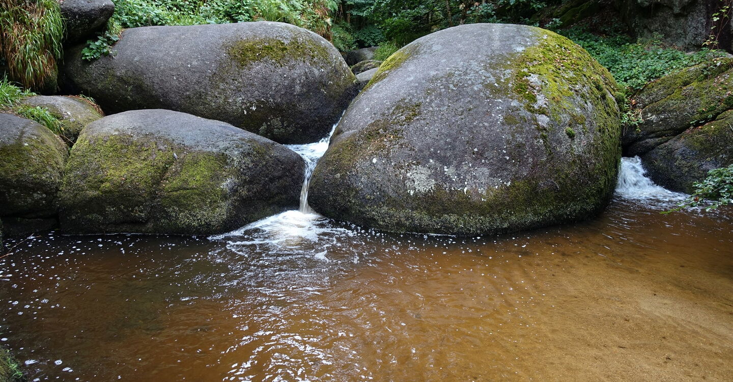 Vom Parkplatz – Start und Ziel der Wanderung – hinter der aus dem Jahr 1591 stammenden Église Saint-Yves de Huelgoat gehen wir bis zum Place Aristide Briand vor und dort rechts durch die Straße bis zum See. Hinter der Brücke befindet sich die alte Mühle Moulin du Chaos. Sie wurde 1339 erbaut und ist das älteste Gebäude in Huelgoat. Wir gehen bei der Crêperie rechts auf dem Pfad weiter. Zwischen den mit Moos bedeckten, riesigen Felsen hindurch erreichen wir die Grotte du Diable (Teufelsgrotte), bei der man über eine rutschige Eisentreppe in die Unterwelt absteigen kann. Auf dem weiterführenden Pfad geht es an mächtigen und rund geschliffenen Granitblöcken vorbei. Bei der ersten Weggabelung gehen wir dann halb links, überqueren den inzwischen unterirdisch verlaufenden Bachlauf und nehmen den ersten Treppenaufstieg, der an einer kleinen Höhle vorbeiführt. Über einen platt geschliffenen Felsen und in den Fels geschlagene Stufen gelangen wir zum 01 Roche Tremblante (164 m) herunter. Der sogenannte zitternde Felsen liegt auf einem schmalen Grat. Findet man den richtigen Druckpunkt in Kombination mit der richtigen Frequenz, so wird der 100 t schwere Granitblock in eine 2 bis 3 cm weite Schwingung versetzt! Bloß wo ist der Punkt?