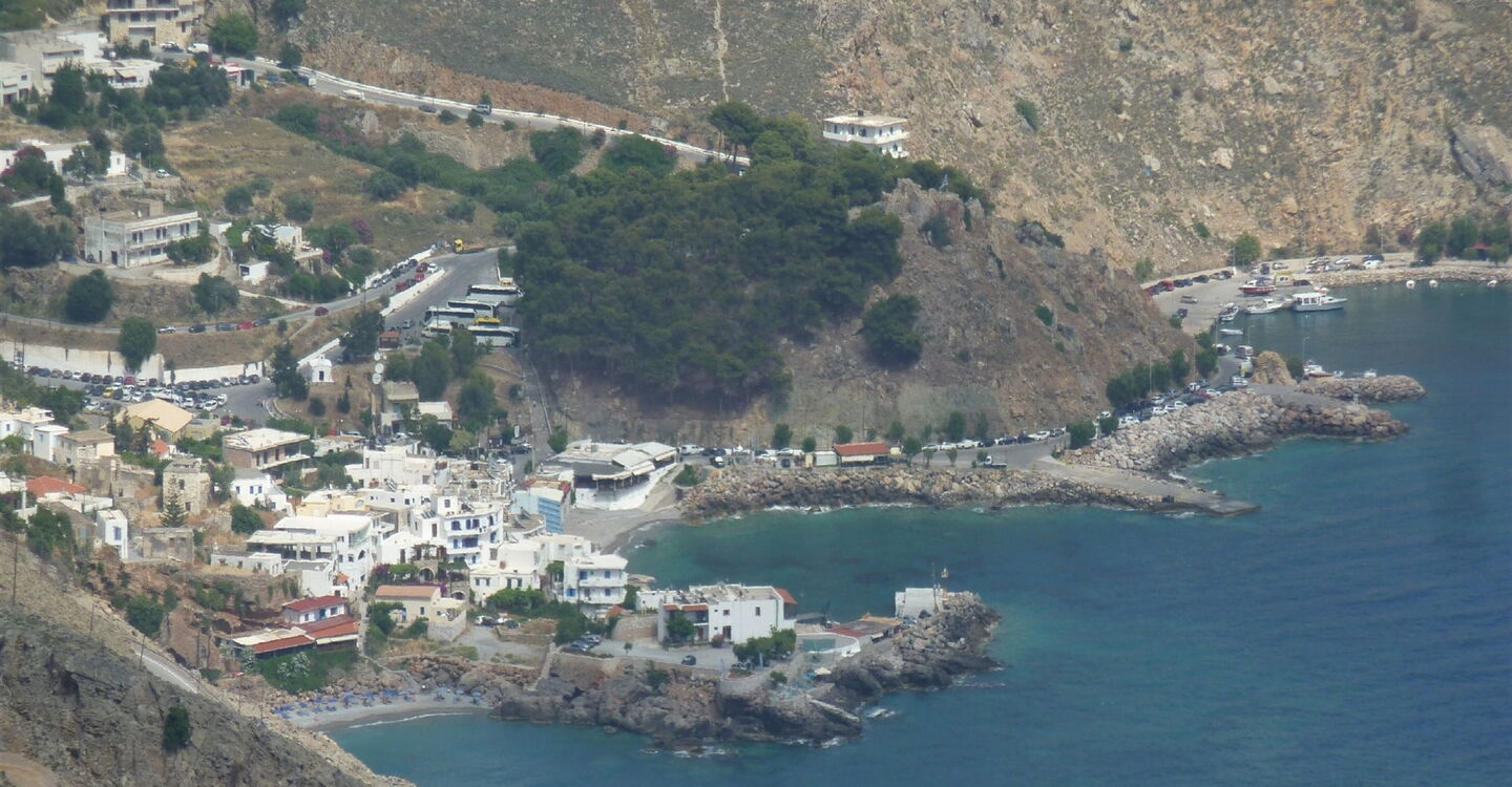 Auf der Piste erreichen wir eine Ziegenhaltung. Auf dem nachfolgenden weglosen Stück wandern wir in Richtung eines Felsens am Horizont, der aussieht wie ein Pilz. Auf einem Küstenpfad queren wir eine Schotterpiste, kommen vorbei an einer weiteren schönen Bucht und erreichen oberhalb vom Filaki-Strand – wohlbekannt unter Anhängern der Freikörperkultur – eine Asphaltstraße. Dieser folgen wir bergauf, gehen bei der folgenden Weggabelung halb rechts und erreichen die Hauptstraße. Nach 1,4 km auf der Hauptstraße gelangen wir zu unserem heutigen Etappenziel 05 Chora Sfakion (16 m).