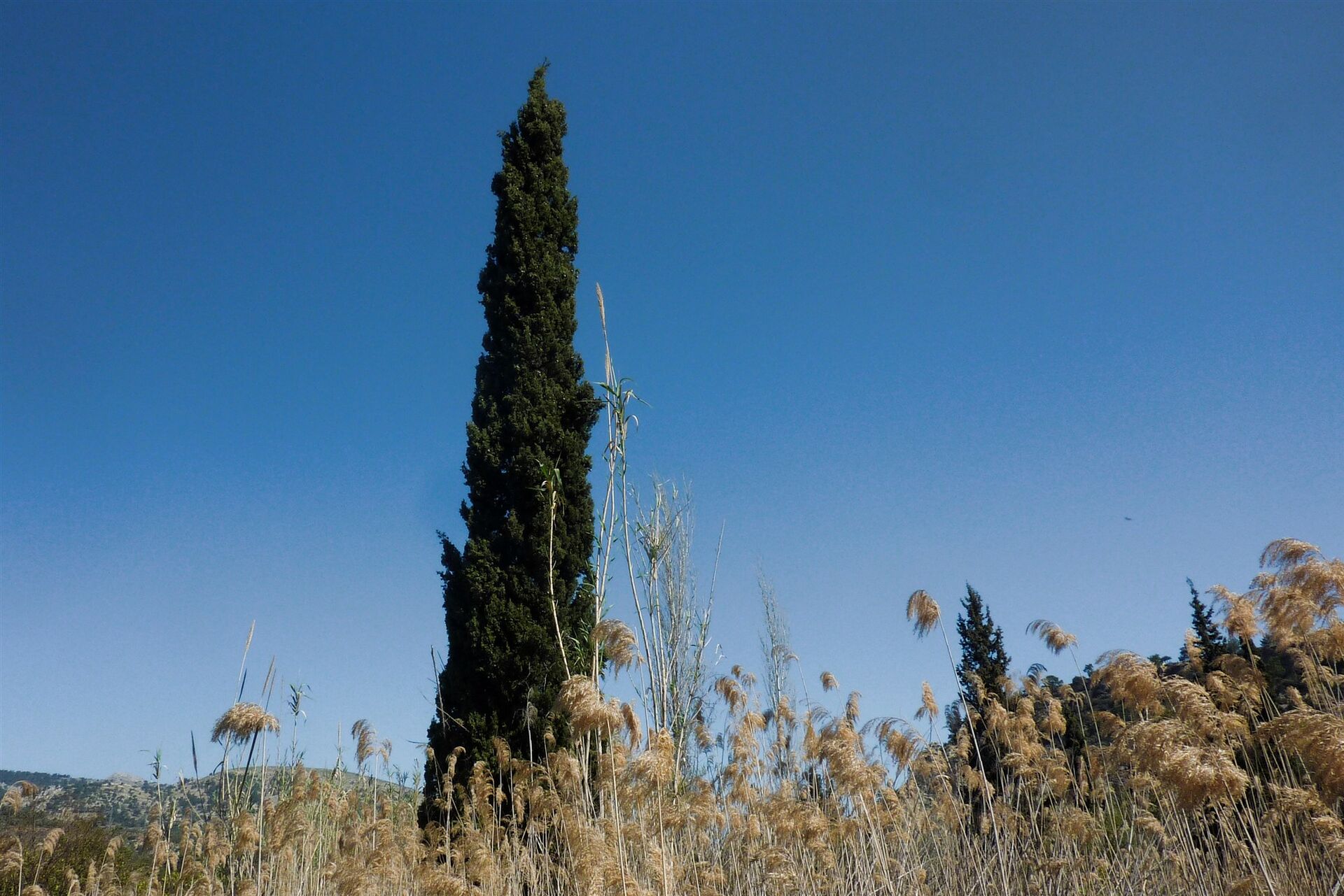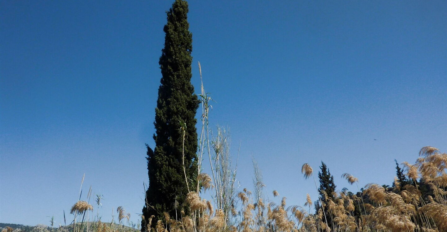 Es geht auf der Schotterpiste talauswärts. Hinter zwei mächtigen Zypressen gehen wir am (05) Abzweiger rechts (121 m) und folgen im weiteren Verlauf dem Hauptweg durch das Schilfgras bis zum Ausgangspunkt der Wanderung.