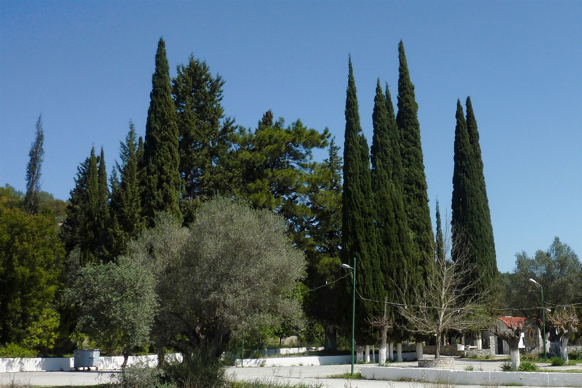 Bei mächtigen Zypressen erreichen wir die (02) Kapelle der Jungfrau Eleimonitria (98 m). Diese lassen wir rechts liegen und wandern auf der betonierten Piste bergauf. Es geht vorbei an einem Viadukt und weiteren Plantagen, tiefer in den sich verengenden Talkessel. An einer 180°-Kehre der Piste befindet sich am Wegesrand eine Metallstange. An dieser Stelle verlassen wir die Piste und gehen halb links auf dem Pfad weiter, der in kleinen Kehren bergab an Bewässerungsleitungen und Plantagen entlang verläuft.