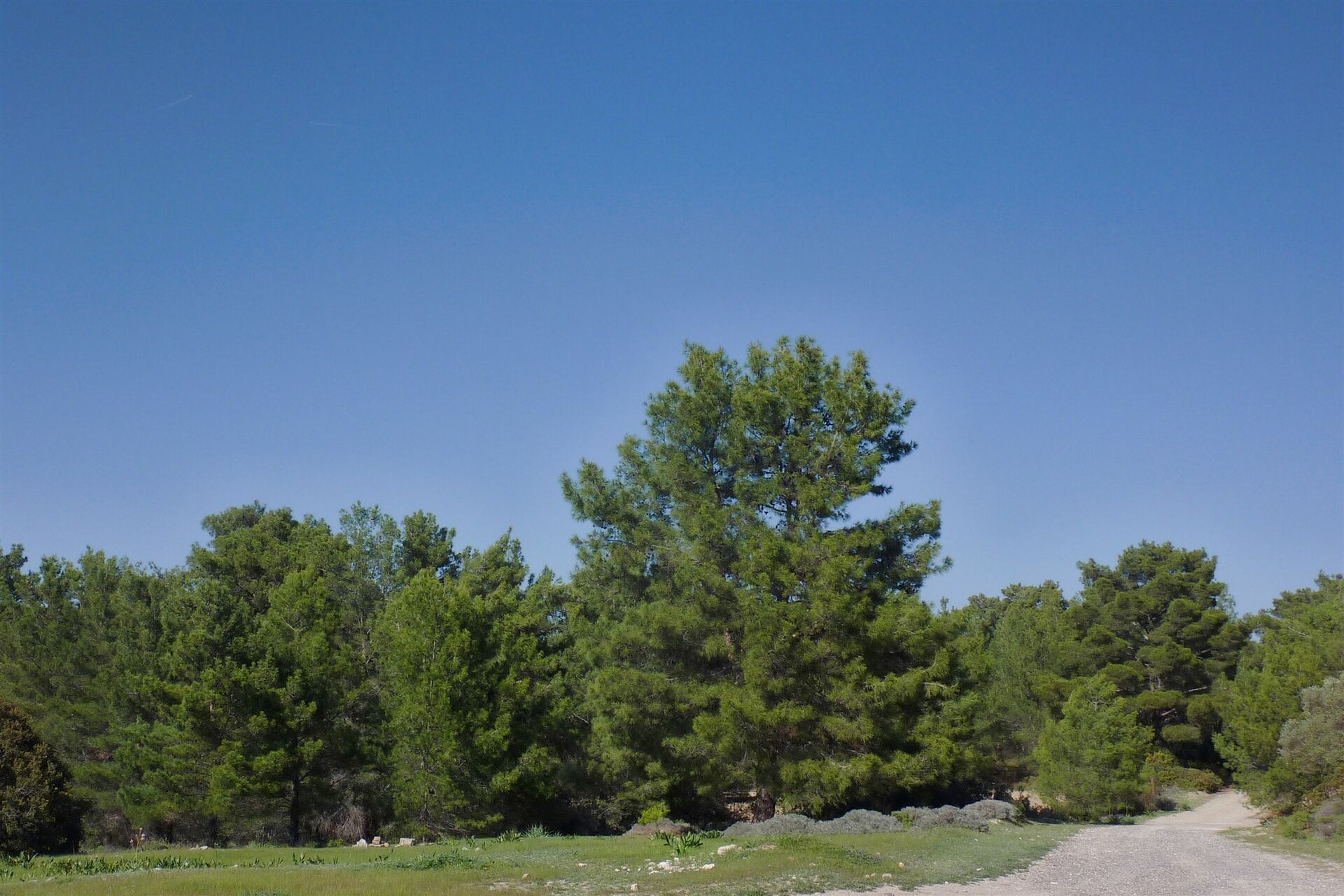 Die Piste endet an einem Zaun, links oberhalb steht ein weißes Haus. Hier gehen wir (02) rechts (122 m) auf der Piste weiter und kommen an einem weiteren Haus direkt neben der Piste vorbei. Wir passieren prachtvolle Kiefern und ignorieren im weiteren Verlauf zwei linke und zwei rechte Abzweiger.
