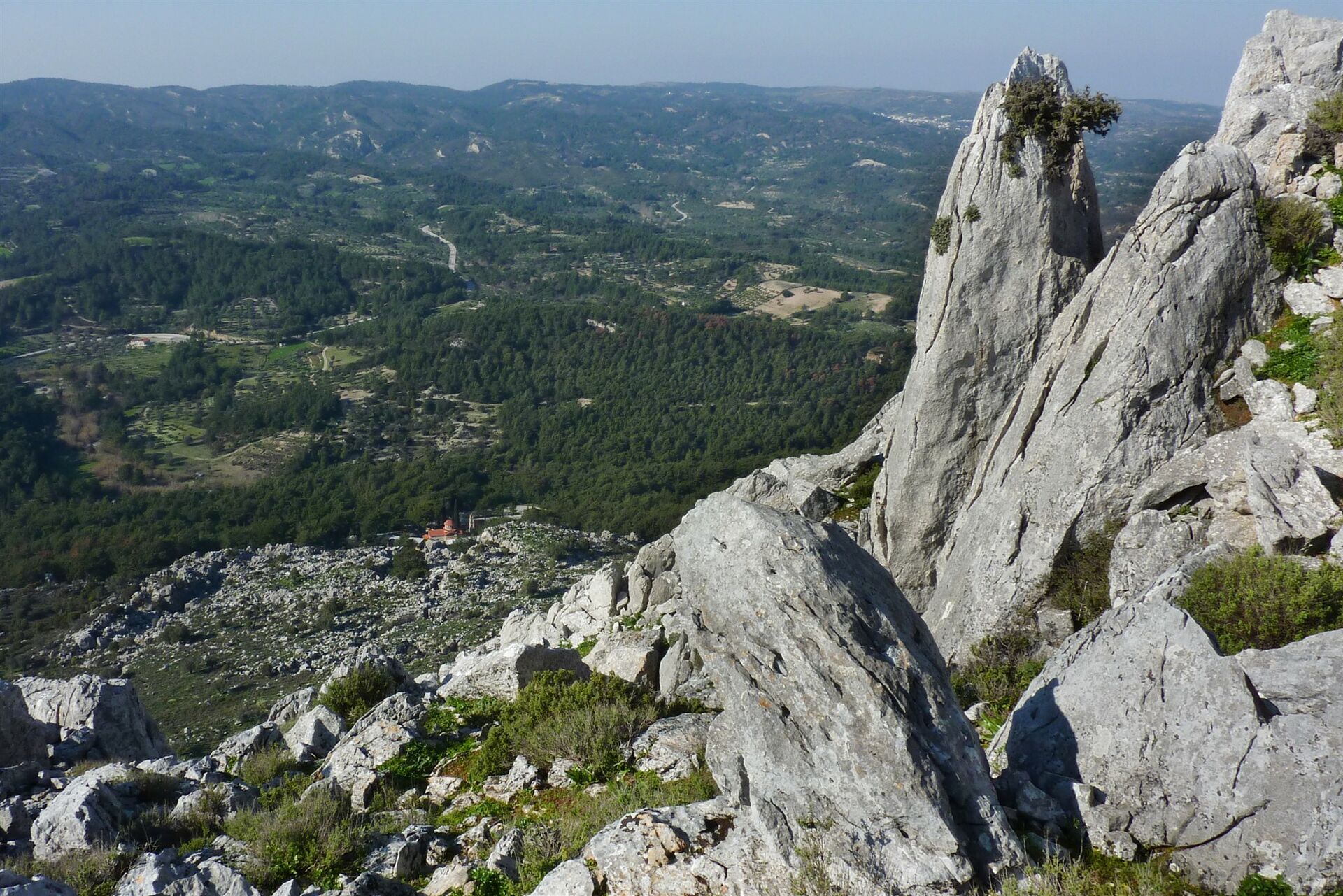 Der Wald lichtet sich und gibt den Blick bis zum Meer frei, links steigt steil die Felswand des Berges Mesovouno auf. Wir sind nun 370 m im freien Gelände gegangen, es liegen zwei große Felsabbrüche am Wegesrand und in 10 m Entfernung steht ein Steinmännchen. Bei dieser (02) Variante eins (227 m) gehen wir 50 m im rechten Winkel zur Schotterpiste über die kleine Anhöhe, um dann dem Verlauf des abfallenden Bergrückens zu folgen. Dabei gehen wir halb rechts weglos an rechts liegenden tiefen Erosionsrissen entlang. In der Ferne sehen wir bereits eine Holzbrücke, nur kurz später treffen wir auf einen gepflasterten Weg und können bis zum Aussichtspunkt vorgehen. Wir gehen anschließend bis zur Holzbrücke zurück. Folgen wir dem gepflasterten Weg, so gelangen wir direkt zum Kloster.