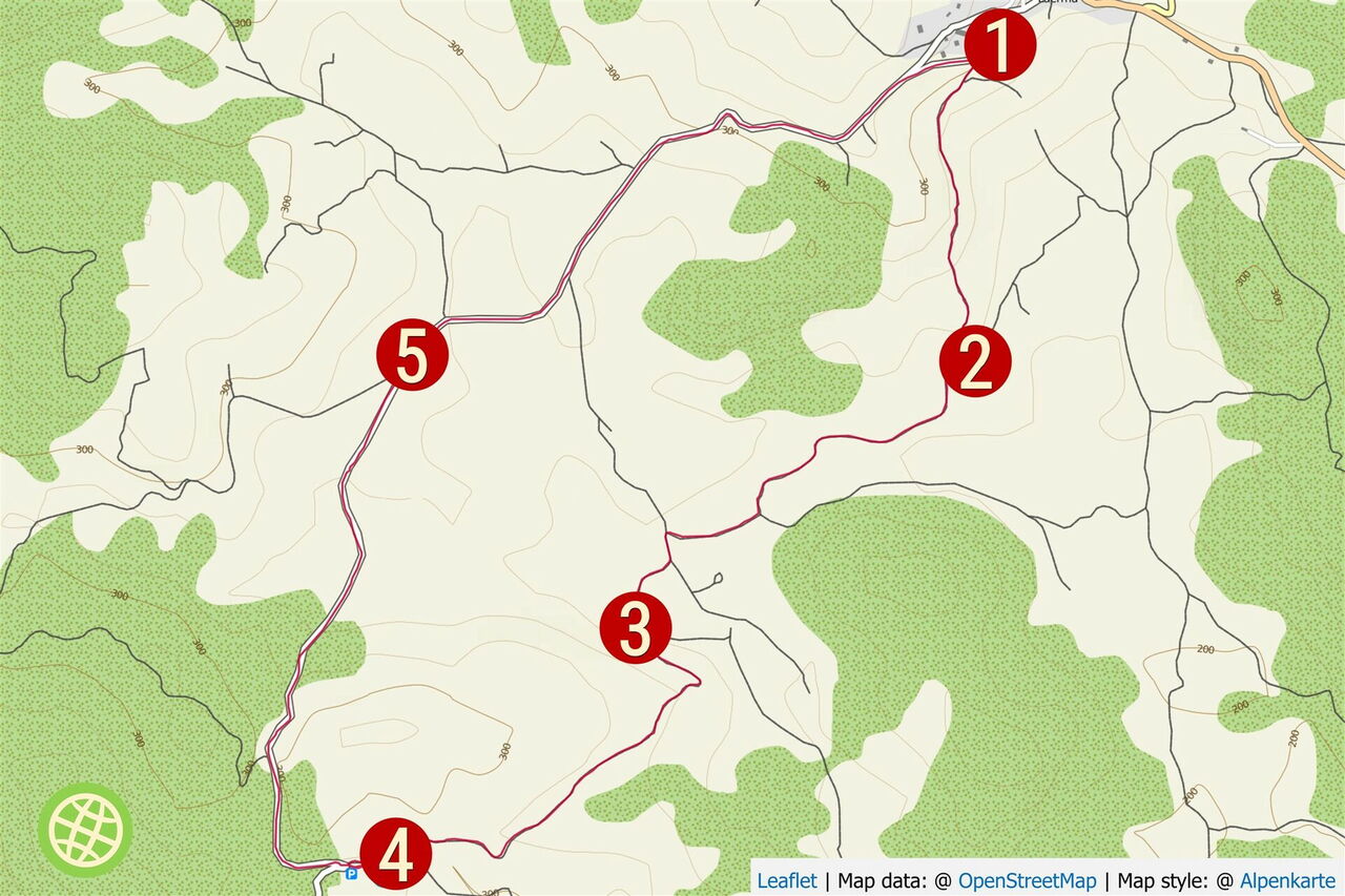 Vom (01) Start und Ziel in Laerma (303 m) gehen wir vom Parkplatz auf der ortsauswärts führenden Asphaltstraße. 70 m nach der ersten Rechtskehre verlassen wir die Asphaltstraße nach halb links auf die bergab führende Asphaltstraße. Auch diese verlassen wir bereits in der folgenden Linkskehre und gehen geradeaus auf die Schotterpiste. Die Piste gabelt sich und wir gehen halb rechts bergab auf die einzeln stehenden Kiefern zu.