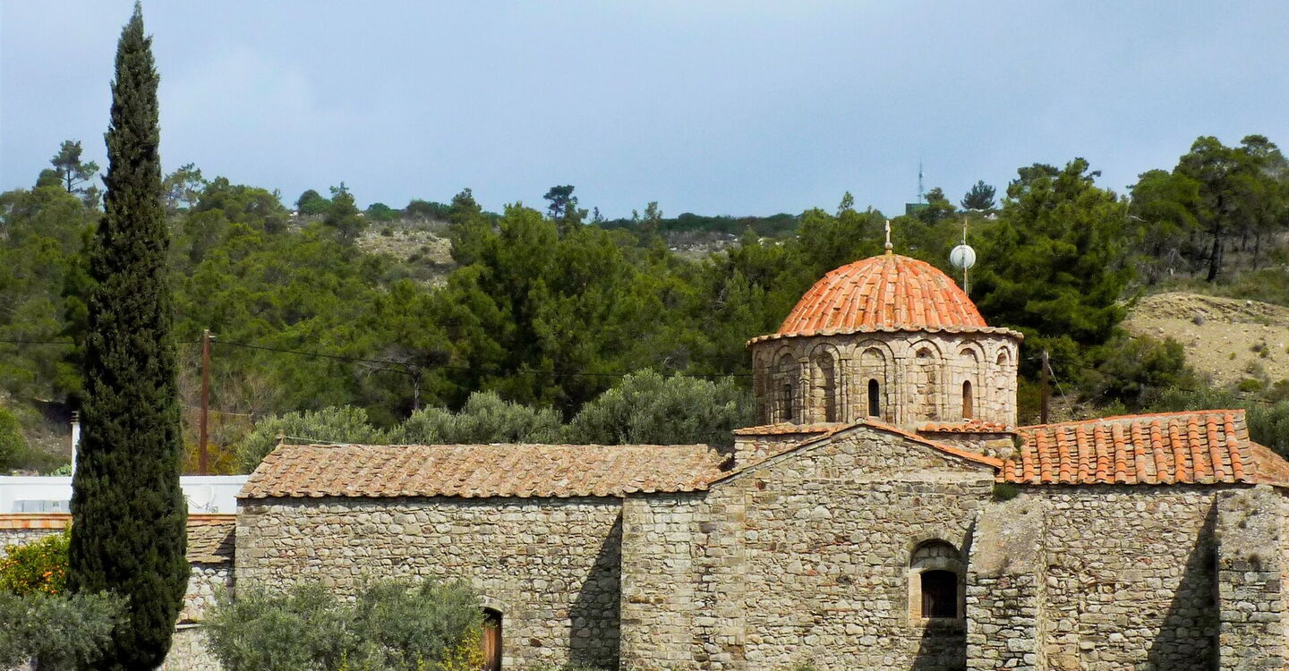 Durch die unberührte Natur von Rhodos führt die Wanderung über einen Bachlauf sowie durch Wälder und Felder zur idyllisch gelegenen Elpida Ranch. Ponys, Pferde, ein Esel und ein kleiner Zoo warten darauf, entdeckt zu werden. Weiter geht es zum sagenumwobenen Kloster Moni Thari. Es wird von einer byzantinischen Prinzessin erzählt, die in der heilenden Natur von einer tödlichen Krankheit geheilt wurde. Als Dank gründete sie im 12. Jahrhundert das Kloster, welches ihren Namen trägt. Zurück geht es auf der wenig befahrenen Asphaltstraße durch Olivenhaine, Eukalyptusbäume, Feigenbäume und an einer Kapelle vorbei.