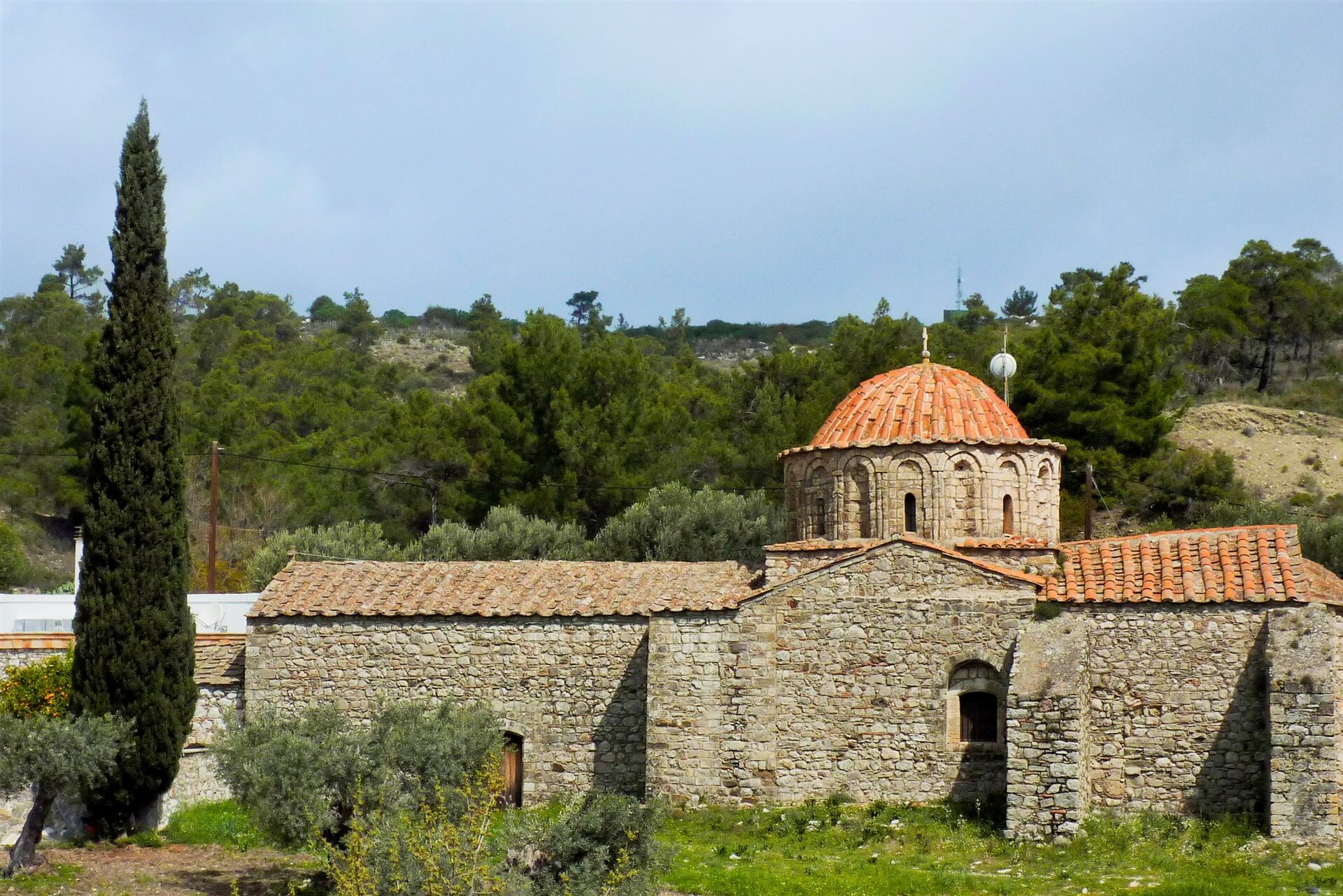 Wir gehen auf der weiterführenden, breit ausgebauten Schotterpiste durch einen lichten Wald und erreichen nach 2,5 km das (04) Kloster Moni Thari (278 m), idyllisch gelegen in einem Kiefernwald. Früher verlassen, wird das Kloster seit einigen Jahren wieder von einer Klostergemeinschaft betrieben.