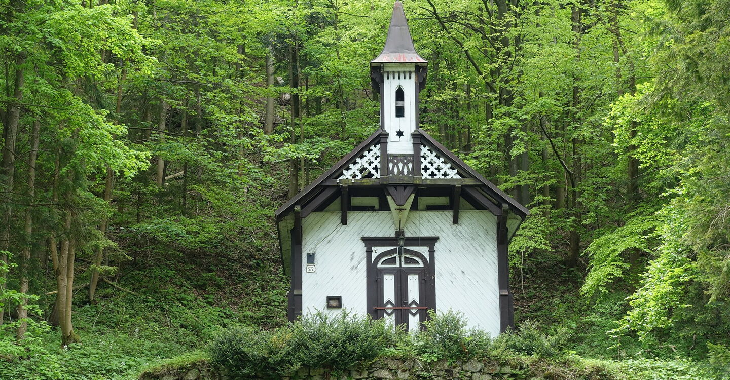 Nachdem dieser in einen Karrenweg gemündet ist, erreichen wir bei Hochspannungsleitungen den 05 Hiadel'ské sedlo (1096 m). Von hier an gehen wir rechts bergab und folgen dem blau ausgeschilderten Wanderweg Richtung Korytnica-kúpele. Nach wenigen Metern bergab zweigen wir bei der Weggabelung auf den rechten Forstweg ab. Der nächste nennenswerte Punkt ist ein einzelnes Haus auf einer Lichtung. Bei mehreren Häusern macht die Forststraße dann nahezu eine 180°-Kehrtwendung. Dort, wo sich der Forstweg hinter einem Bachlauf gabelt, wandern wir weiter links bergab. Entlang der Ruinen des Heilbads Korytnica-kúpele gehen wir talwärts, aber nicht ohne unsere Trinkflaschen mit dem heilsamen Mineralwasser aufzufüllen, das in der Vergangenheit sogar nach Amerika exportiert wurde!