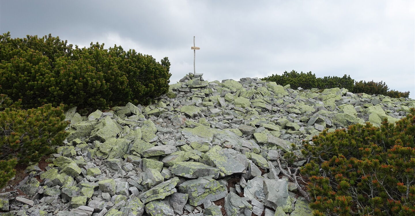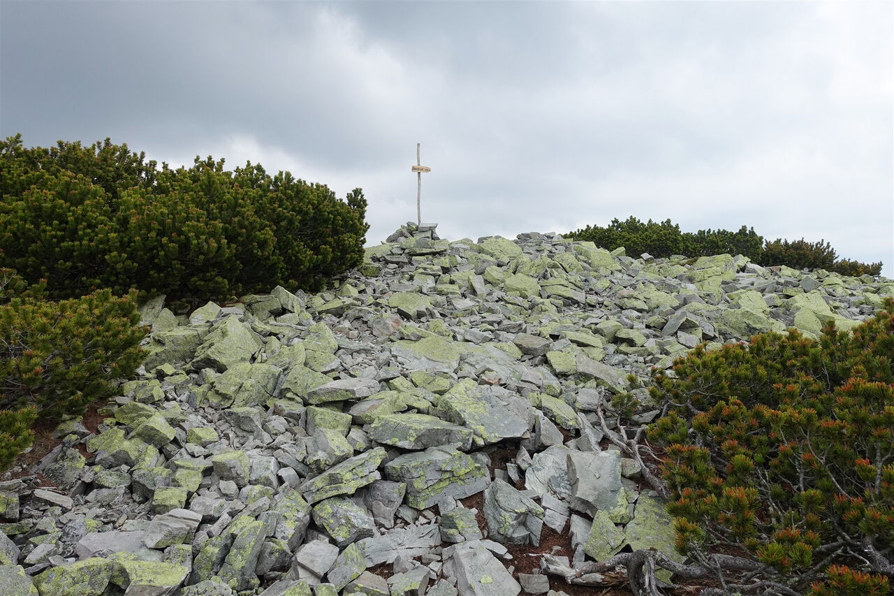 In südwestlicher Richtung steigen wir zur Einsattelung ab und nach kurzem Wiederaufstieg erreichen wir den felsigen Gipfel des 04 Prašivá (1675 m). Hinter dem Gipfel setzen wir unseren eingeschlagenen Weg fort und steigen durch Latschenkiefern ab. Es folgt ein längerer Abstieg auf einem ausgetretenen Pfad.