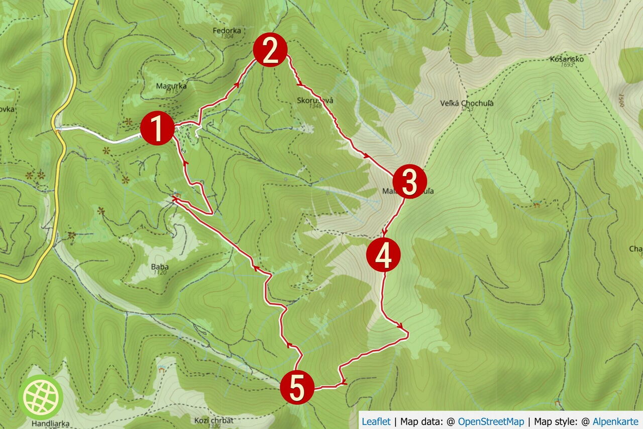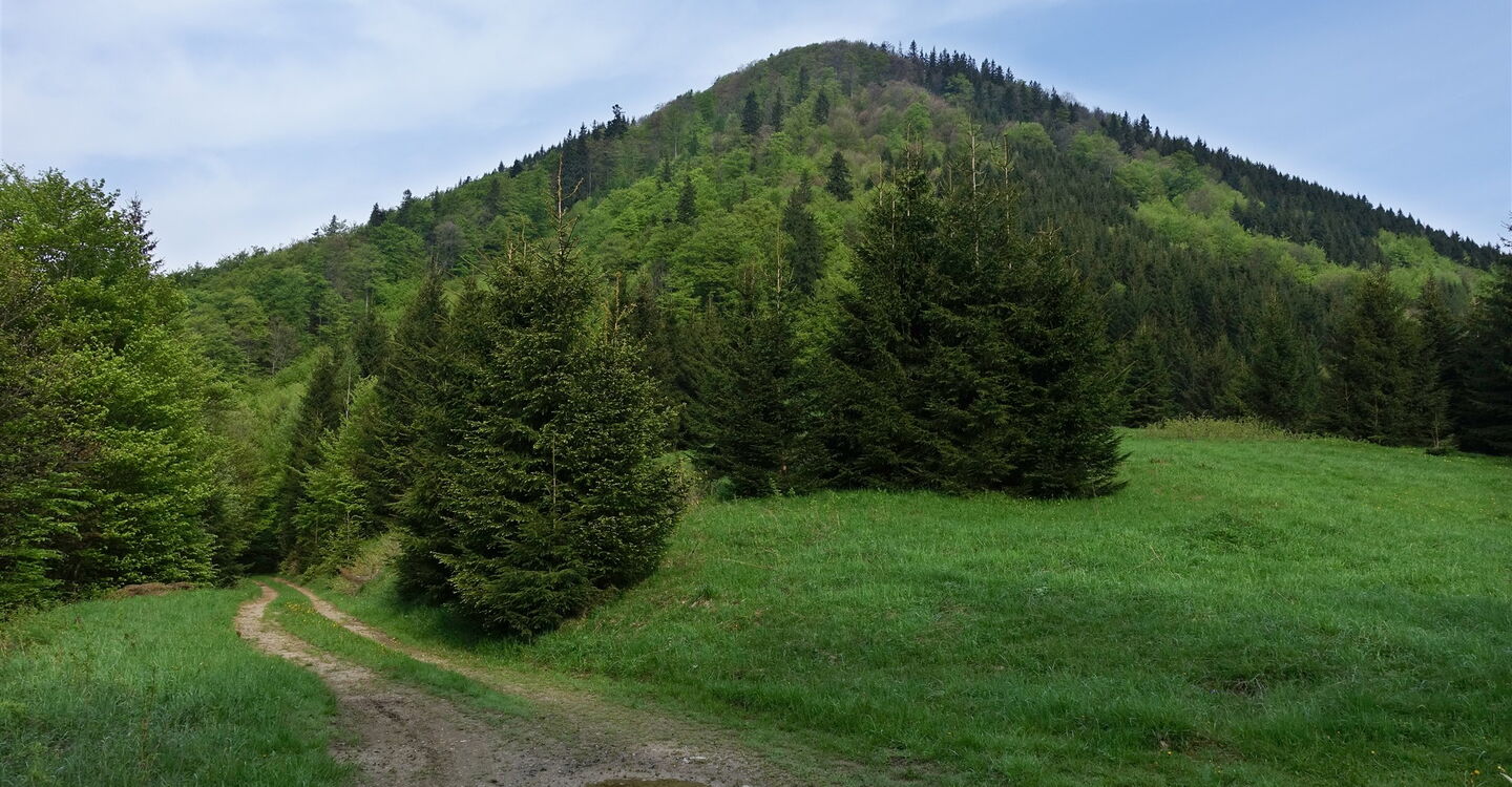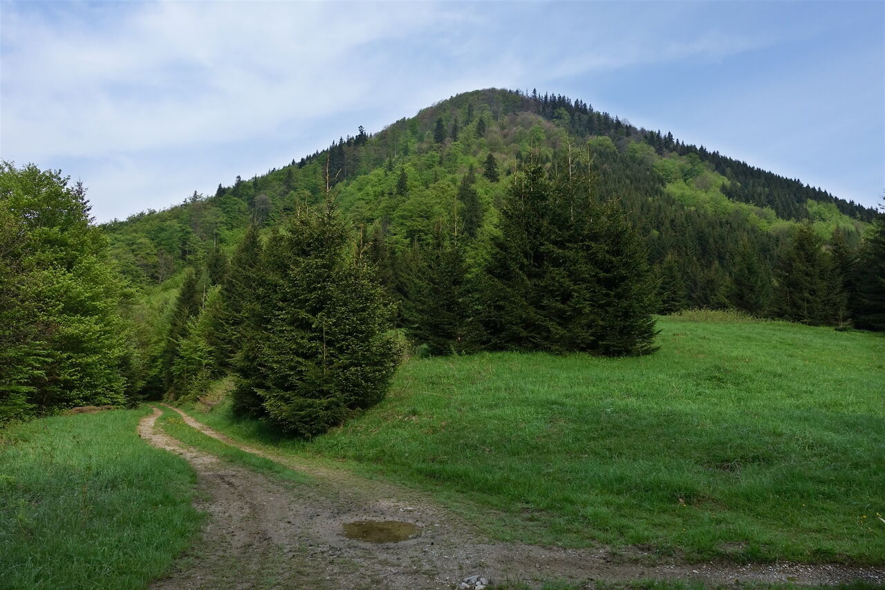 In dem kleinen Dorf 01 Korytnica-kúpele (822 m) marschieren wir taleinwärts bis zu einer Brücke, um dort an der Weggabelung halb links auf der asphaltierten Straße bergauf zu gehen. Zunächst gehen wir links an einem Bachlauf entlang. Wir queren dann einen weiteren Bachlauf, der in den Bachlauf fließt, an dem wir links entlanggehen. An dieser Stelle verlassen wir die Asphaltstraße nach links und wechseln auf einen Weg. Nach einigen Metern überqueren wir denselben Bachlauf, den wir bereits zuvor überquert hatten, noch einmal. Bei der darauffolgenden Weggabelung nehmen wir den halb links bergauf führenden Waldweg. An einer Buche befindet sich eine rote Wegmarkierung und hinter der zweiten roten Markierung gehen wir auf einem Pfad durch eine Rechtskurve.