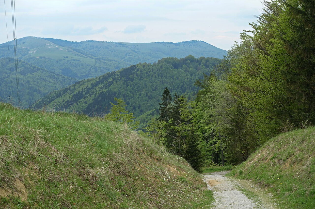Auf dem nachfolgenden ebenen Wegstück gehen wir an der Weggabelung halb links. Unser Pfad durch den Wald mündet in eine Forststraße, wir gehen links und erreichen die Wegekreuzung 02 Prislop (1070 m). An dieser nehmen wir den ersten rechten Abzweiger in den Wald. Den sofort folgenden rechten Abzweiger ignorieren wir und bei der nachfolgenden Weggabelung – diese ist auf dem selten begangenen Pfad schwer zu erkennen – gehen wir nun halb rechts. Auch auf dem nachfolgenden Wegstück durch den Wald ist der Pfad nur schwer zu erkennen. Dort, wo der Wald lichter wird, ist wieder eine Trittspur vorhanden. Kurz später überschreiten wir den 1348 m hohen Skorušová. Wir erreichen ein Kahlschlagfeld und müssen uns unseren eigenen Weg durch die umgestürzten Bäume zu suchen.