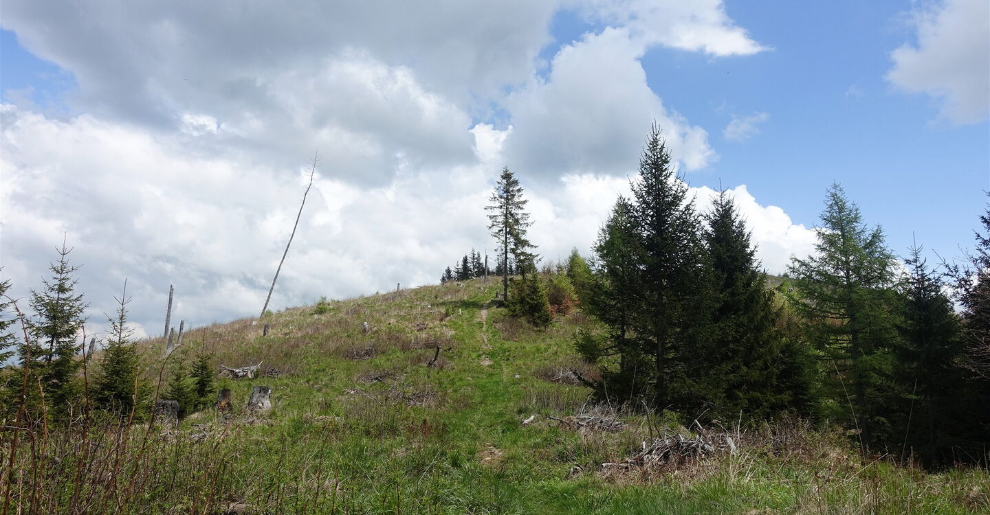 Wir folgen der Forststraße durch die Rechtskehre – hier befindet sich ein Markierungsstein mit der Nummer 145. Dann überschreiten wir eine kleine Anhöhe und gehen wenige Meter zu einer Einsattelung herunter. Direkt vor uns befindet sich ein kleiner Hügel. Seinen linken Berghang queren wir auf einem zunächst unscheinbaren Pfad. Die nachfolgende Einsattelung überqueren auf einem Pfad nach rechts, bis dieser an einem 03 querenden Pfad (1168 m) endet. Wir gehen nun rechts und folgen dem blau markierten Wanderweg. Nach einem schönen Waldweg gelangen wir in offenes Gelände und können bis zum Hauptkamm der Niederen Tatra schauen. Gut zu erkennen ist der Kráľova hoľa mit seinem Funkmast (siehe Tour 25).