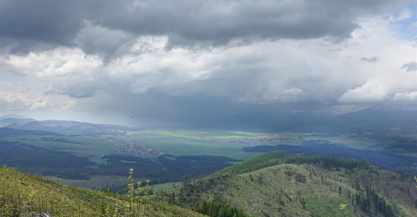 Leicht bergab traversieren wir über einen Berghang bis zu einem rechten Abzweiger und folgen dort dem blau ausgewiesenen Pfad. Bei der nachfolgenden Einsattelung orientieren wir uns an der Weggabelung halb links und erreichen schlussendlich den Gipfel des 04 Kozí kameň (1255 m). Richtung Norden schaut man auf die Westliche und die Hohe Tatra, Richtung Nordosten erkennt man die Stadt Poprad und Richtung Süden sieht man die östliche Region der Niederen Tatra. Wir überschreiten den Gipfel und marschieren nun auf dem weiterführenden Pfad bergab.
