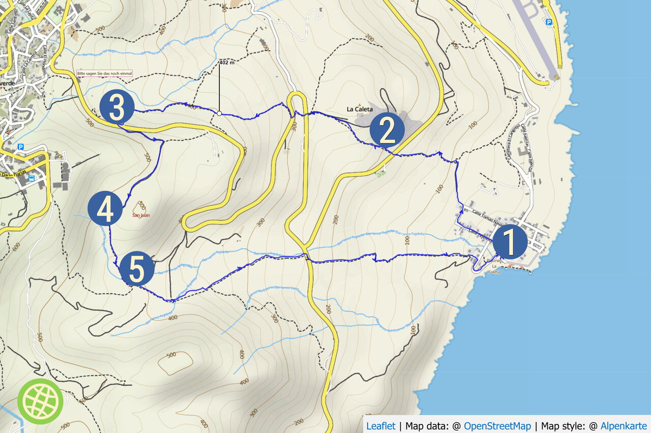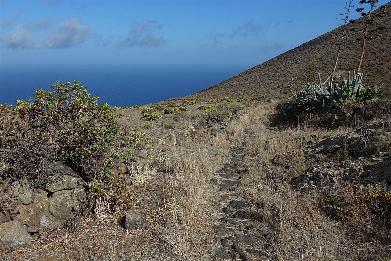 Bei einer weiß-rot-gelben Markierung mündet unser Pfad in den (05) Camino Ancho (416 m), dem wir 500 m bis zur nächsten Weggabelung folgen, um dort nicht halb rechts zum Hafen, sondern halb links weiter Richtung La Caleta abzusteigen. Noch einmal überqueren wir die Hauptstraße, bis wir die ersten Häuser von Caleta erreichen. Wir gehen rechts durch die Linkskehre und erreichen den Parkplatz am Ausgangspunkt.