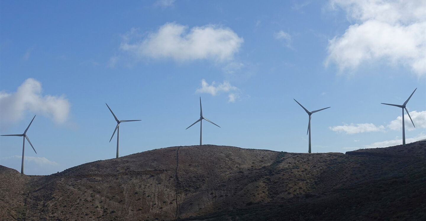 Hinter einer Anhöhe gehen wir nun direkt auf die fünf riesigen Windräder zu, bis die (04) Piste endet (488 m). Am Ziegengatter gehen wir halb links. Auf dem teilweise stark zugewachsenen Camino geht es durch dichtes Gestrüpp, entlang von eingestürzten Trockensteinmauern und quer liegenden Blütenstängeln von Agaven.