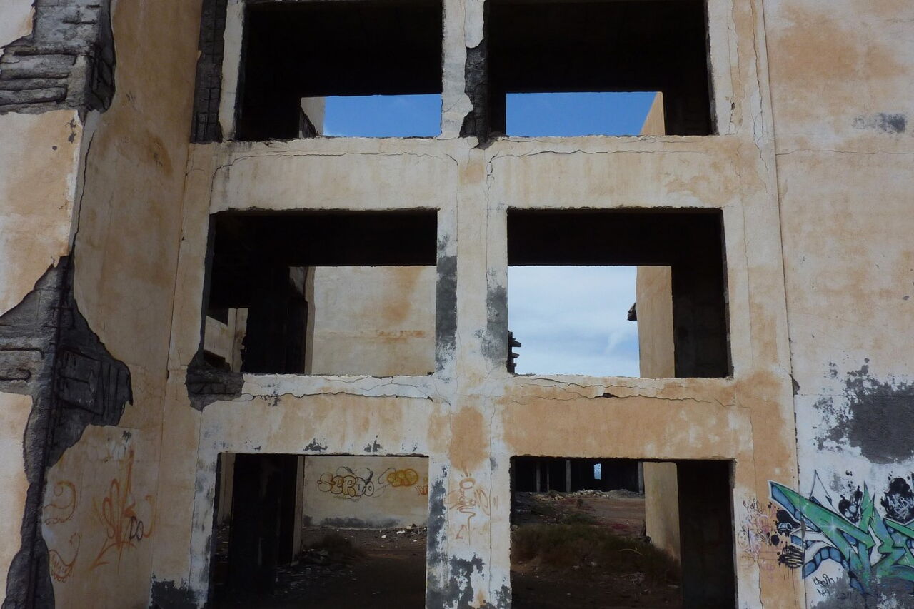 Immer deutlicher lässt sich am Horizont die (03) Bauruine (26 m) des geplanten Hotels Atlante del Sol erkennen, auf die wir nun direkt zusteuern. Bei den Vulkanausbrüchen der Neuzeit erschuf die Natur eine bizarre Mondlandschaft. In den siebziger Jahren verwüsteten Immobilienspekulanten und Baulöwen vieles, was die Natur zuvor noch verschont hatte. Neben diesem Zeitzeugen werden wir am Playa Blanca sehr viele weitere leer stehende Apartmentanlagen und Bauruinen antreffen.
