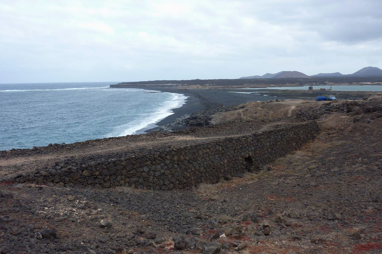 Bei der Palmenallee und der (01) Bushaltestelle (51 m) im Ort La Hoya gehen wir in südwestlicher Richtung gerade durch den kleinen Kreisverkehr, um für 800 m auf der Asphaltstraße zu bleiben. Rechts unterhalb von uns liegen die Salinen. Bei einer Parkmöglichkeit gehen wir halb rechts auf den Pfad, der mit einer 9 auf einem rostigen Pfeiler markiert ist. Wir queren ein Barranco und gehen links an einer Ruine vorbei. Bei der Schotterstraße halten wir uns rechts und gehen nun direkt auf den Playa de Janubio zu, um nach 50 m links auf dem Küstenpfad weiterzuwandern.